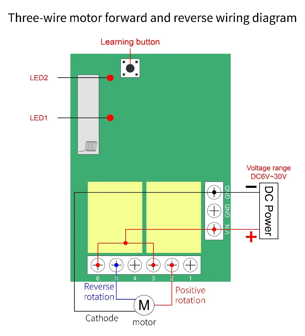 2. Режим переключения:Нажмите ing два раза кнопку обучения на плате приемника дважды (светодиодный индикатор на плате приемника будет сигнализировать одновременно), затем нажмите любую из кнопок дистанционного управления, сигнал три раза через светодиодный пульт дистанционного управления позволяет успешно установить режим переключения.