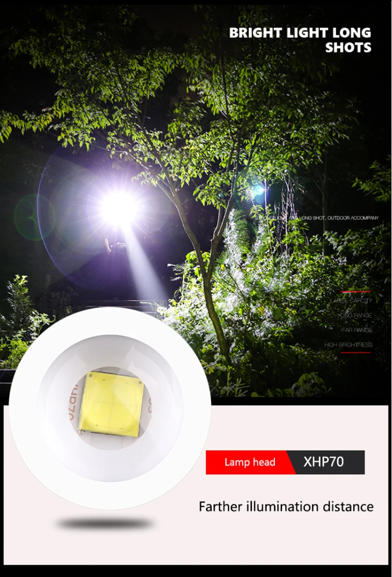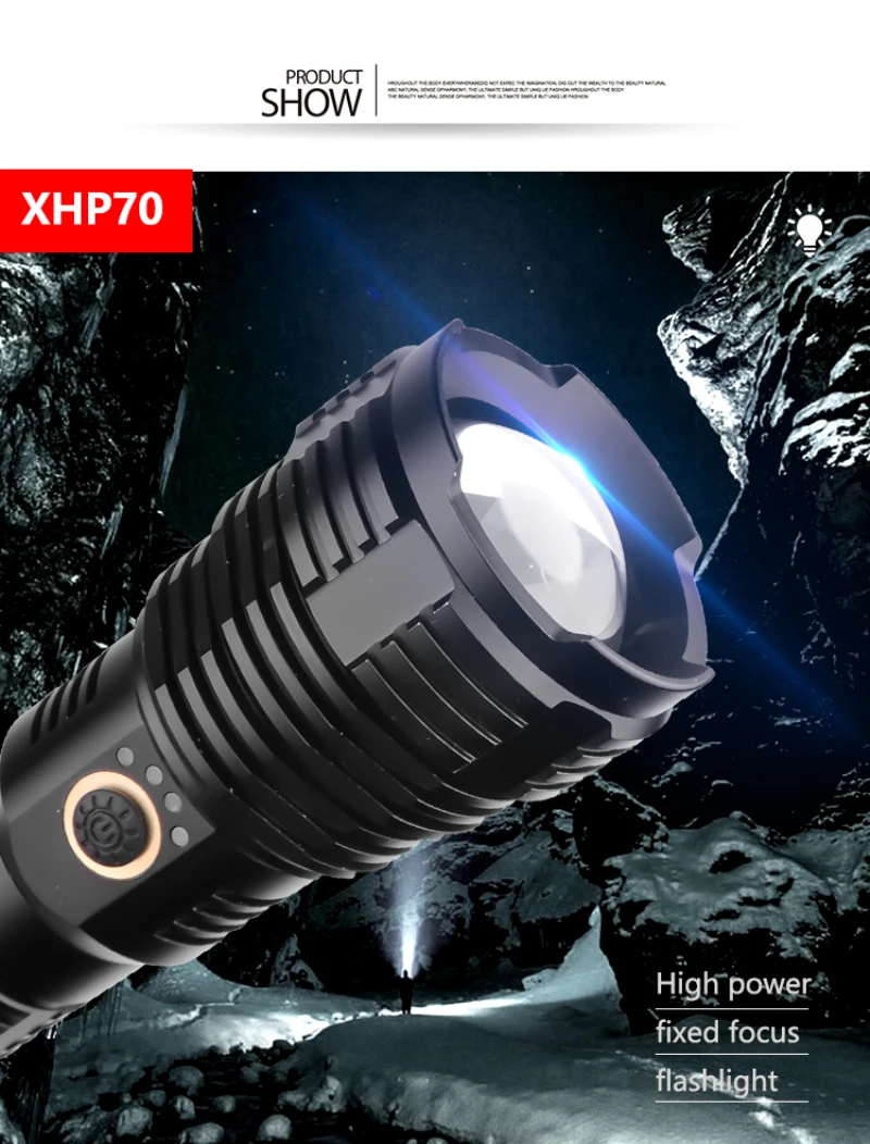 Мощный светодиодный фонарик использует XLamp XHP70.2 светодиодный фонарик для максимальной выходной мощности до 120000 люменов.