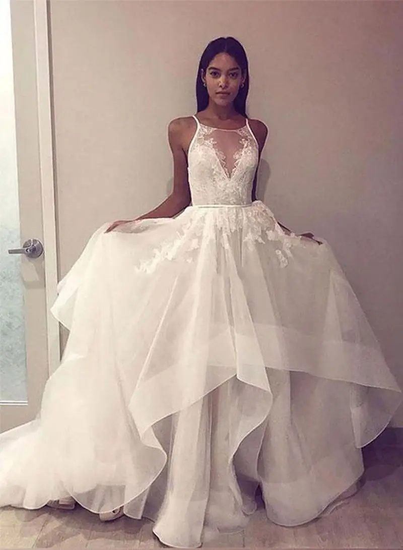 Великолепные трапециевидные Свадебные платья на бретельках с аппликацией кружевное женское платье со шлейфом и открытой спиной индивидуальное свадебное платье