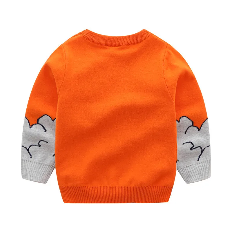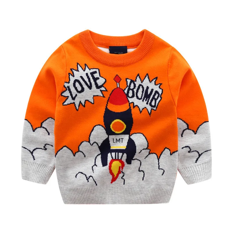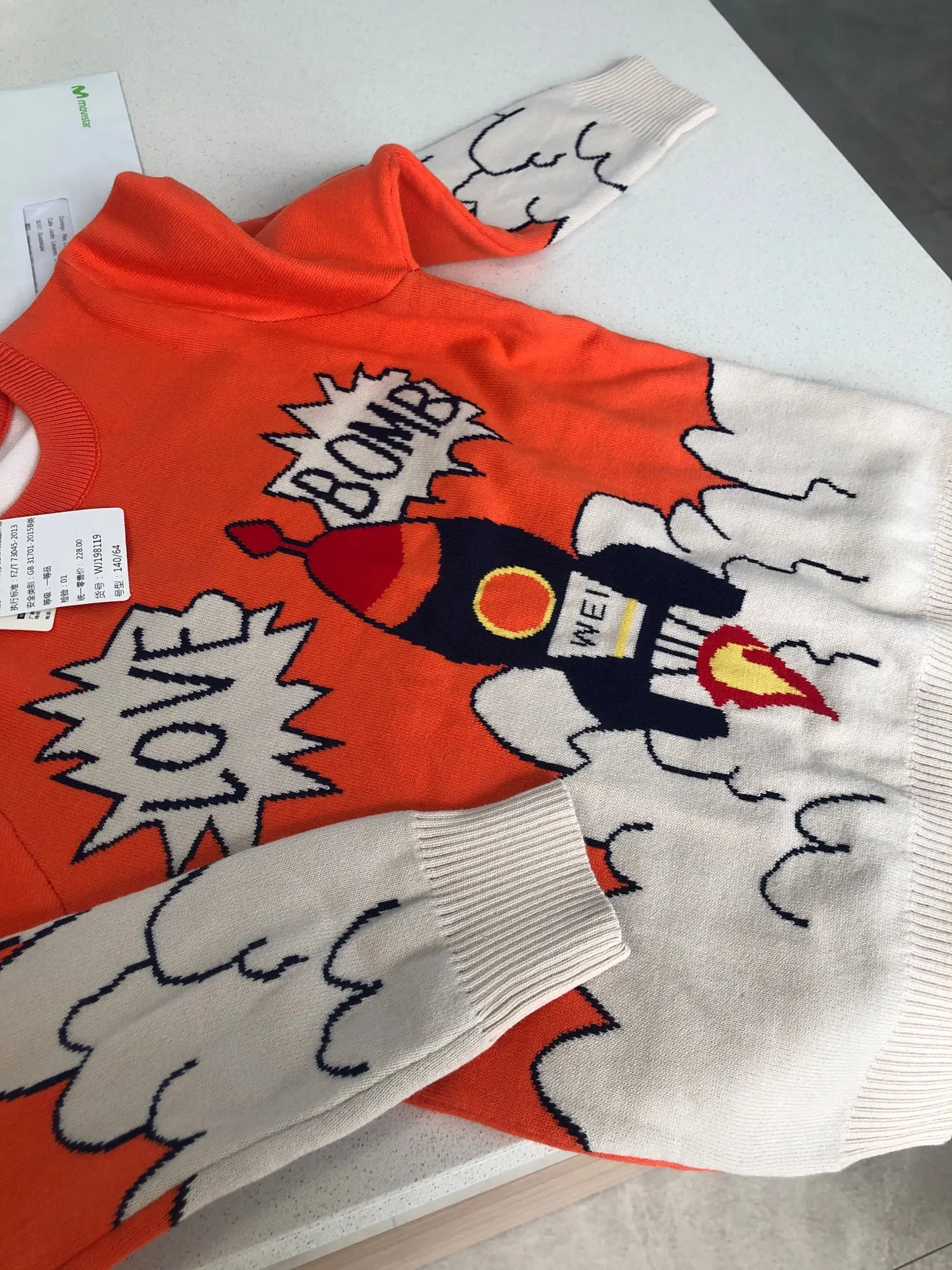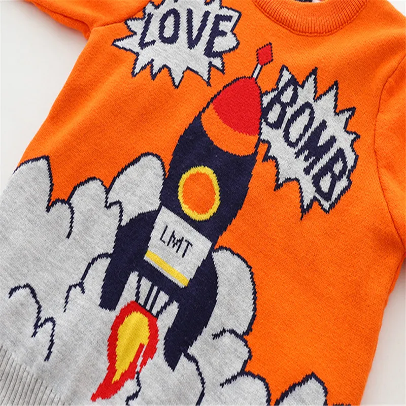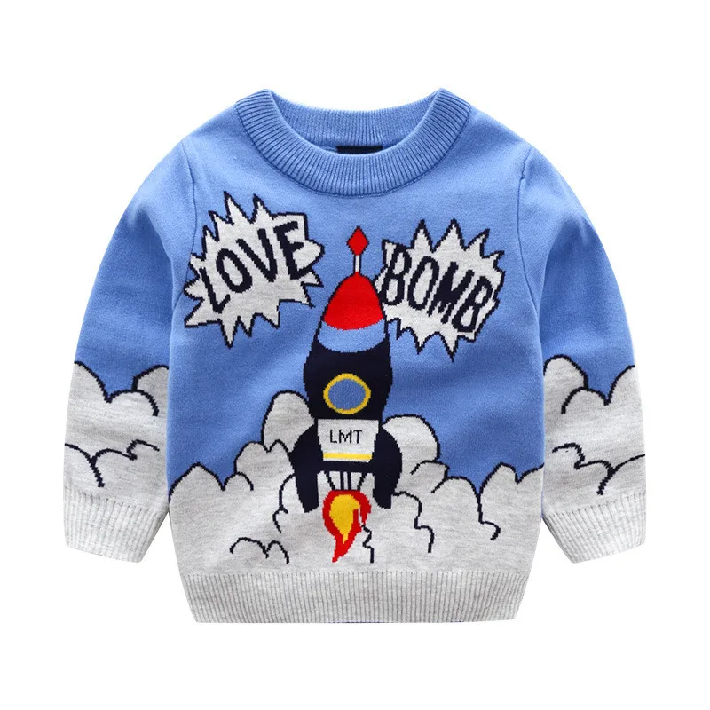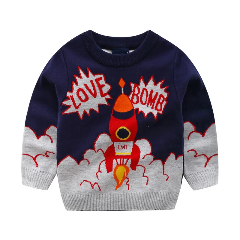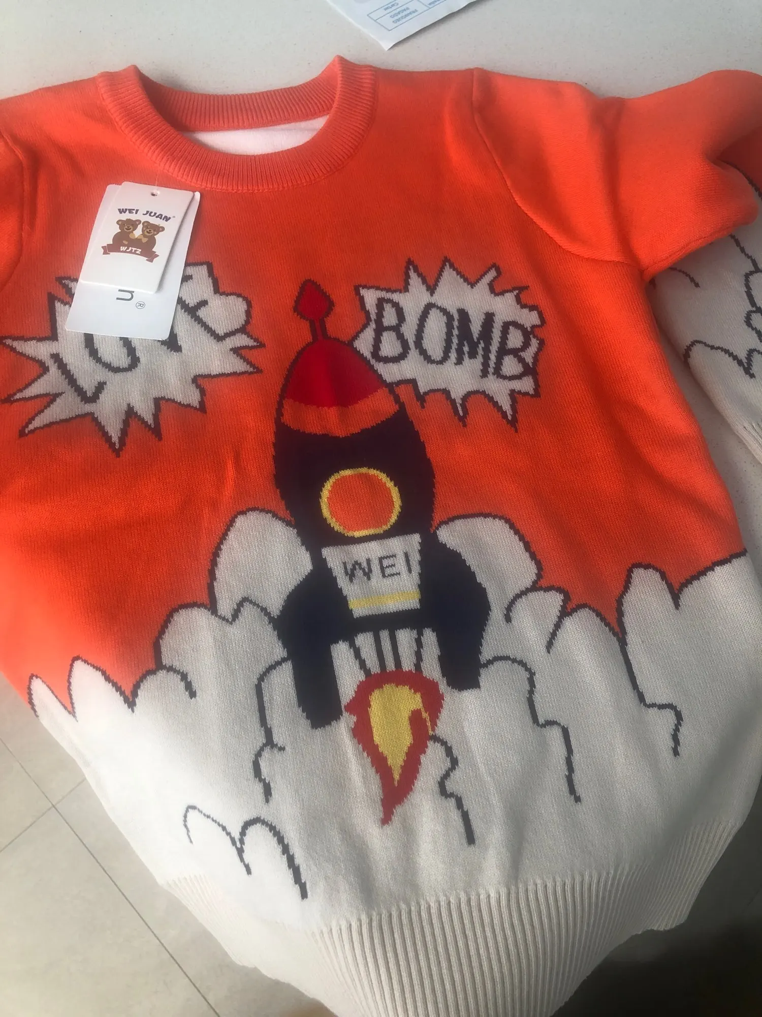 Джемпер просто огромный! Не на 5 лет, конечно, как указано в таблице продавца (105-110, в реальности он и есть на рост 130 см). Лет на 6-7. Качество хорошее. И да, выхлопы от ракеты не белые, как кажутся на фото, а бежевые.