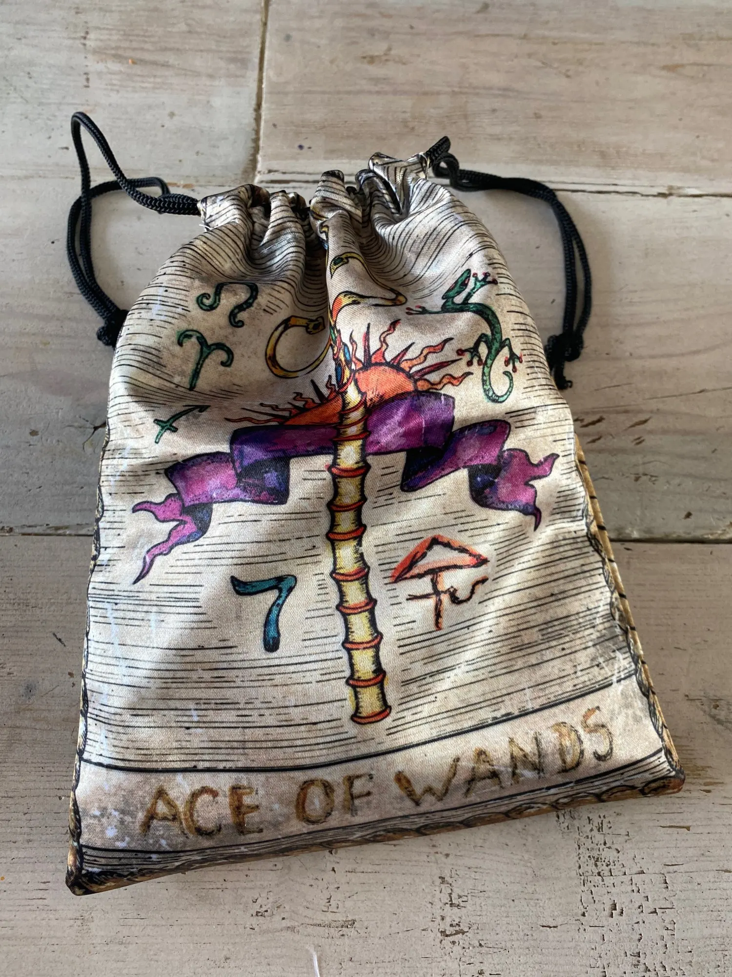 Мешочек очень большой! Его можно было сделать для колоды таро ровно в половину! Сверху шелк на подкладе. Для карт очень большой.