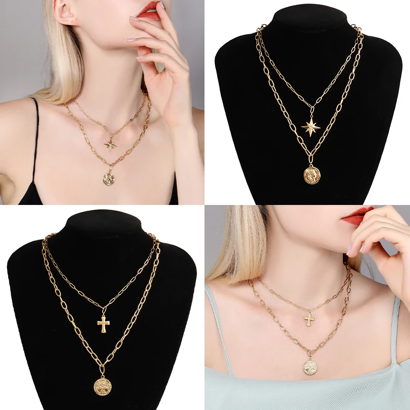 Многослойная цепь в стиле панк, висячий замок, крест, длинное ожерелье, парное ожерелье, хип-хоп, Геометрическая подвеска из нержавеющей стали, ожерелье для женщин