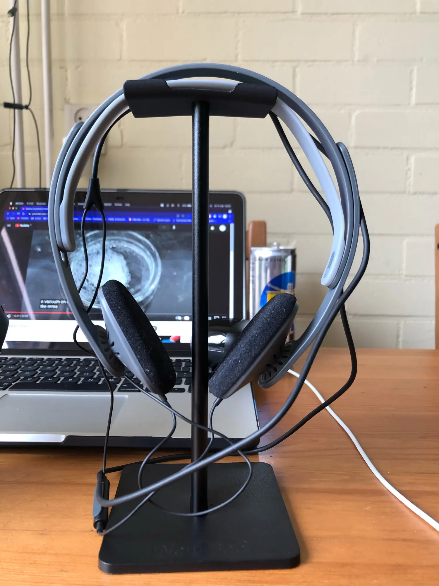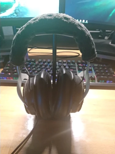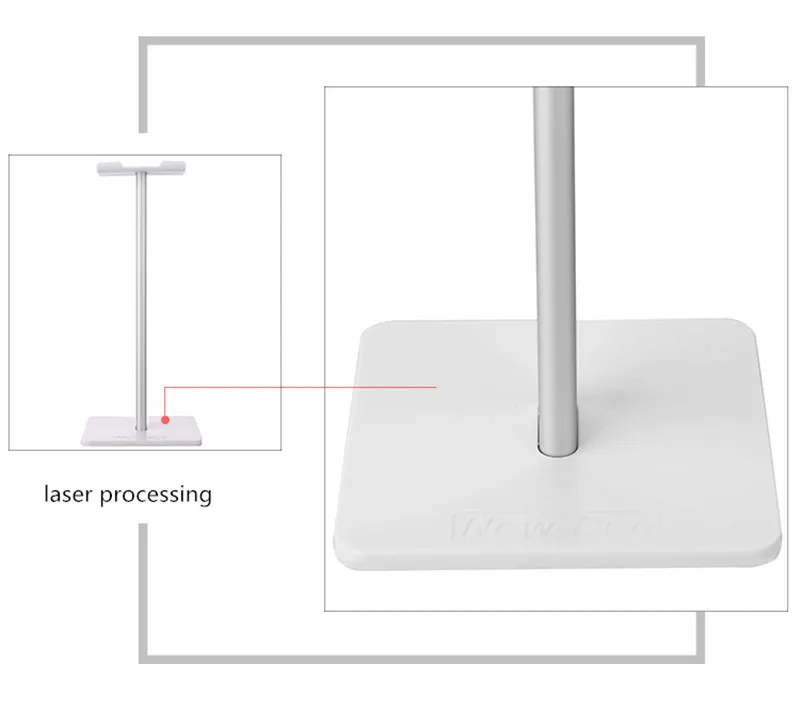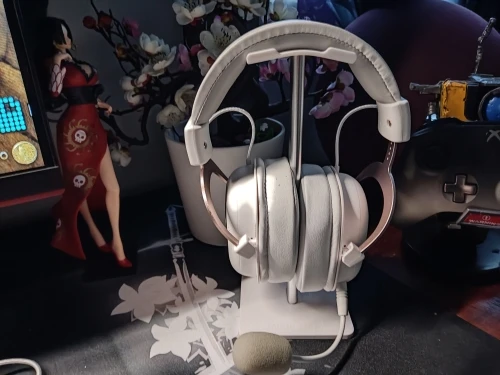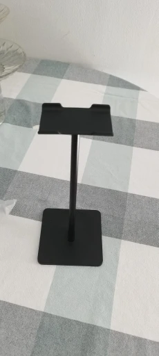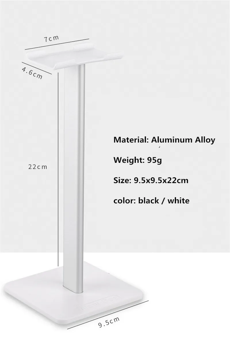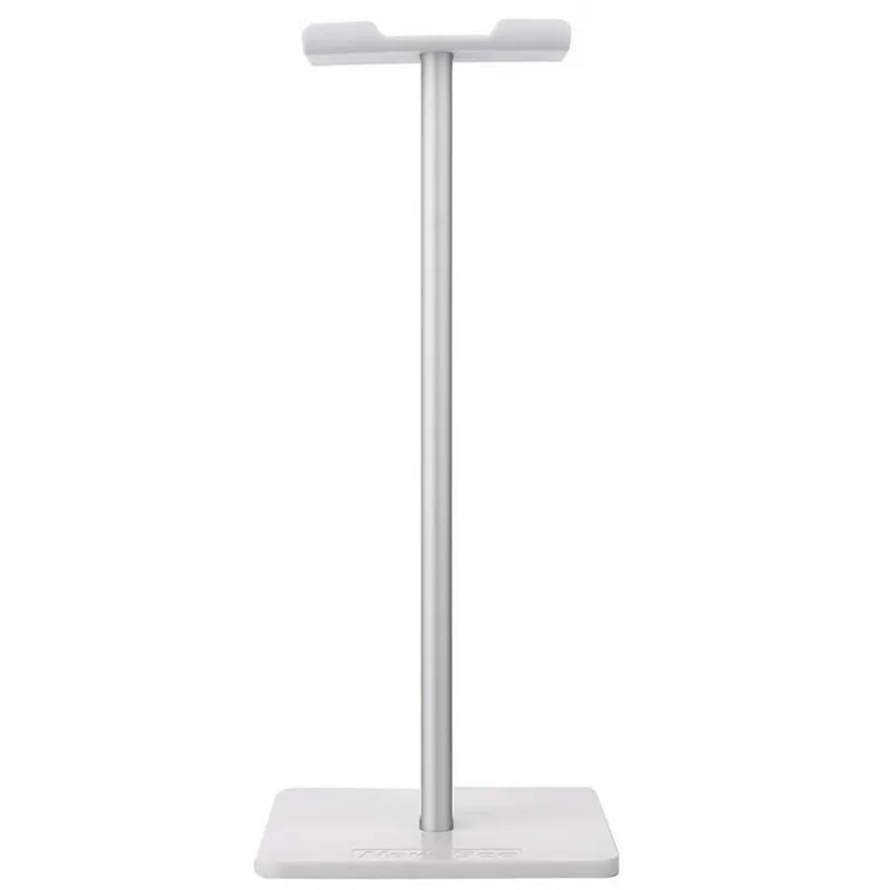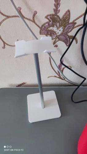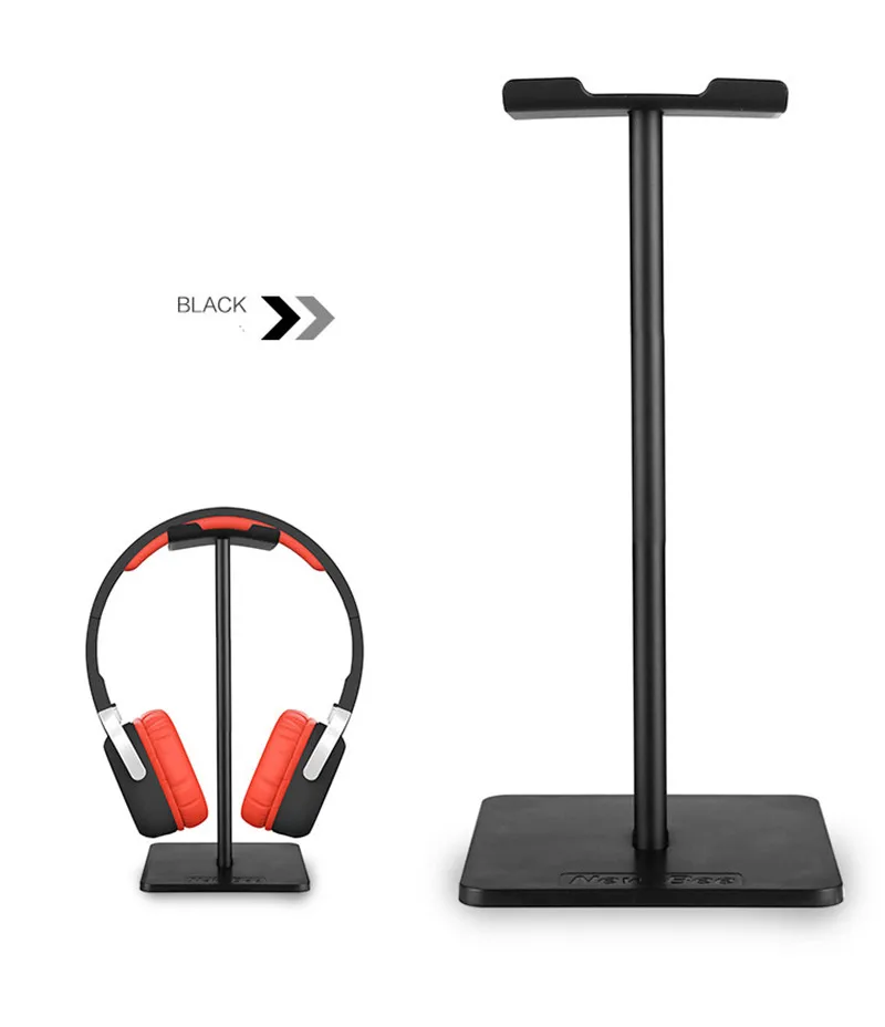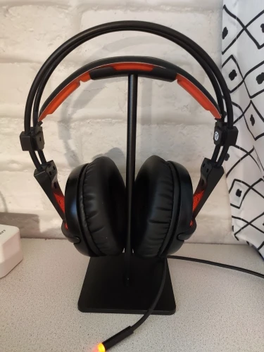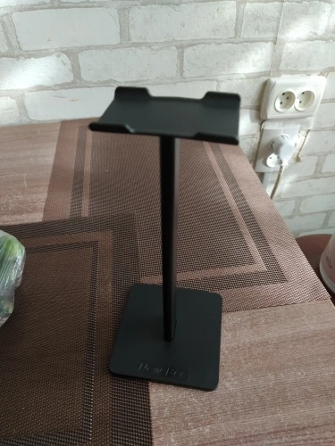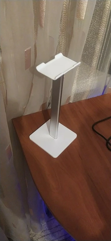 хорошая подставка, есть резиновые ножки, видно по фото, что большие наушники могут упираться в стол. верхняя планка силиконовая, гнется, середина крашеный алюминий, может скалываться краска, на подставке внизу надпись
