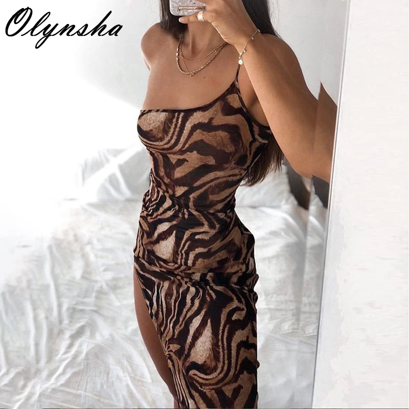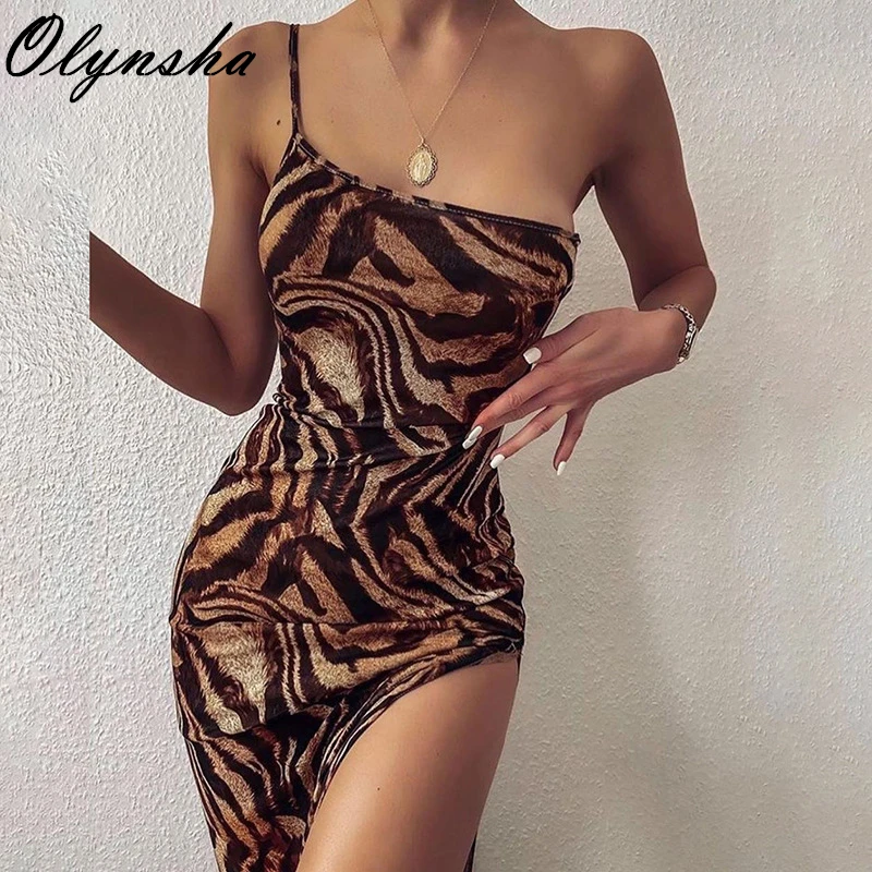 Женское платье с вырезом лодочкой, облегающее длинное платье с Боковым Разрезом и принтом тигра, платье на одно плечо, спагетти на бретелях, уличная мода, лето 2020