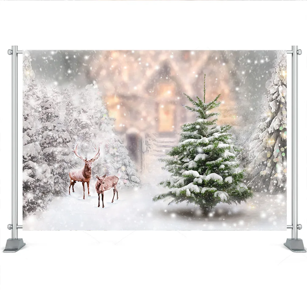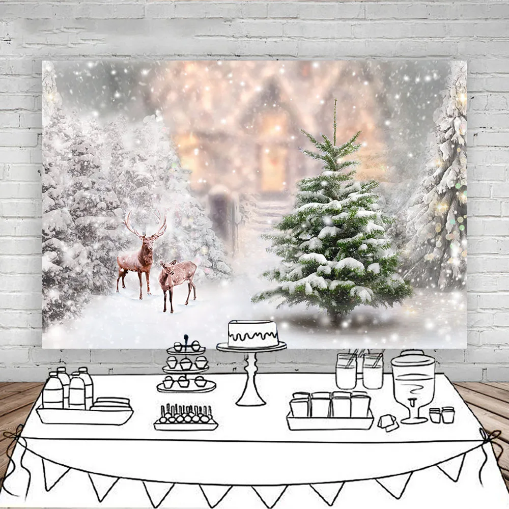 Рождественский олень снег тематический фон Рождественская елка Фэнтези лес фон для фотографии деревянный дом фотосессия