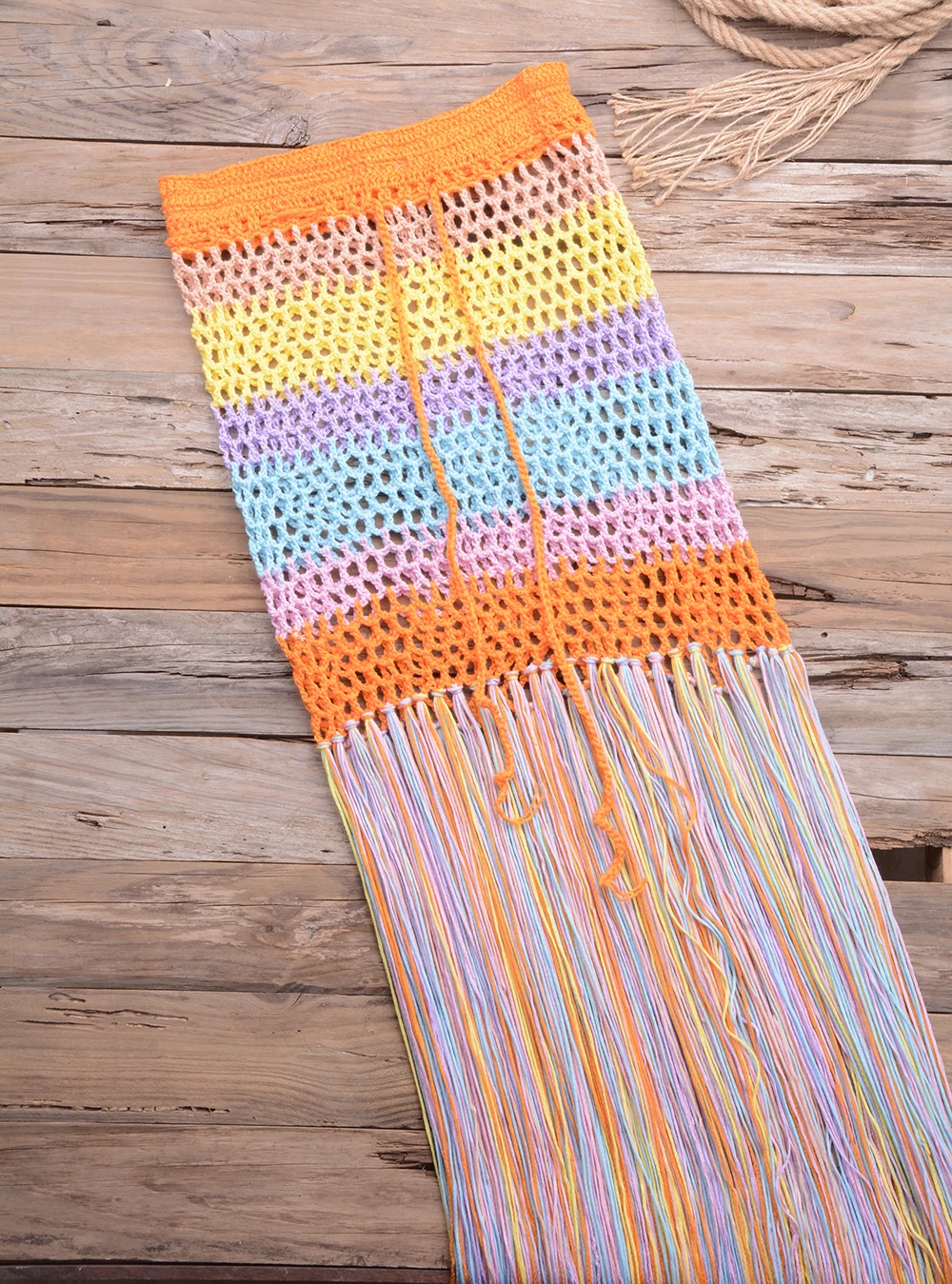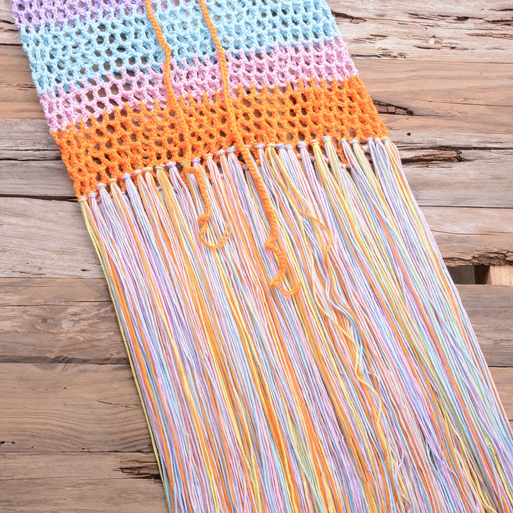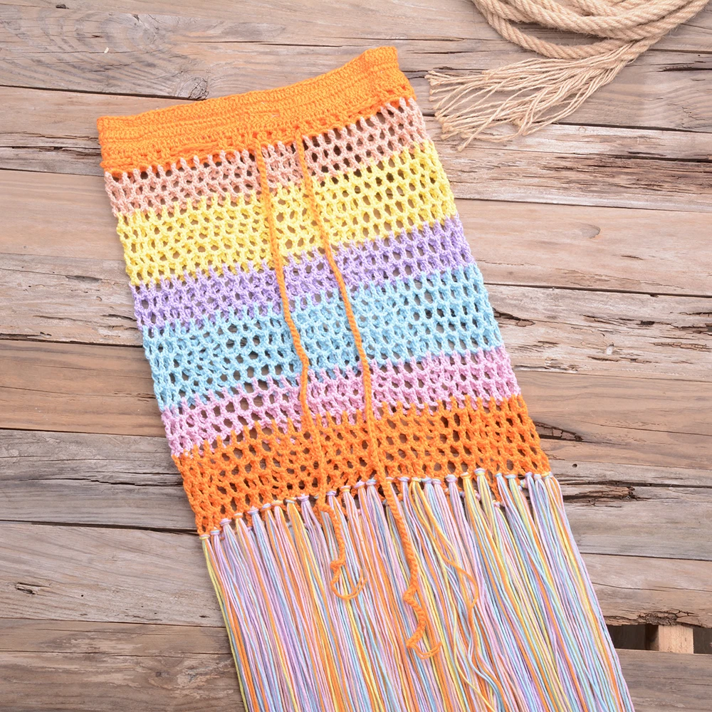 Женская Пляжная накидка, модная туника, бандажные купальные костюмы, вязаный крючком Радужный принт, ажурное бикини с бахромой, юбка, платье