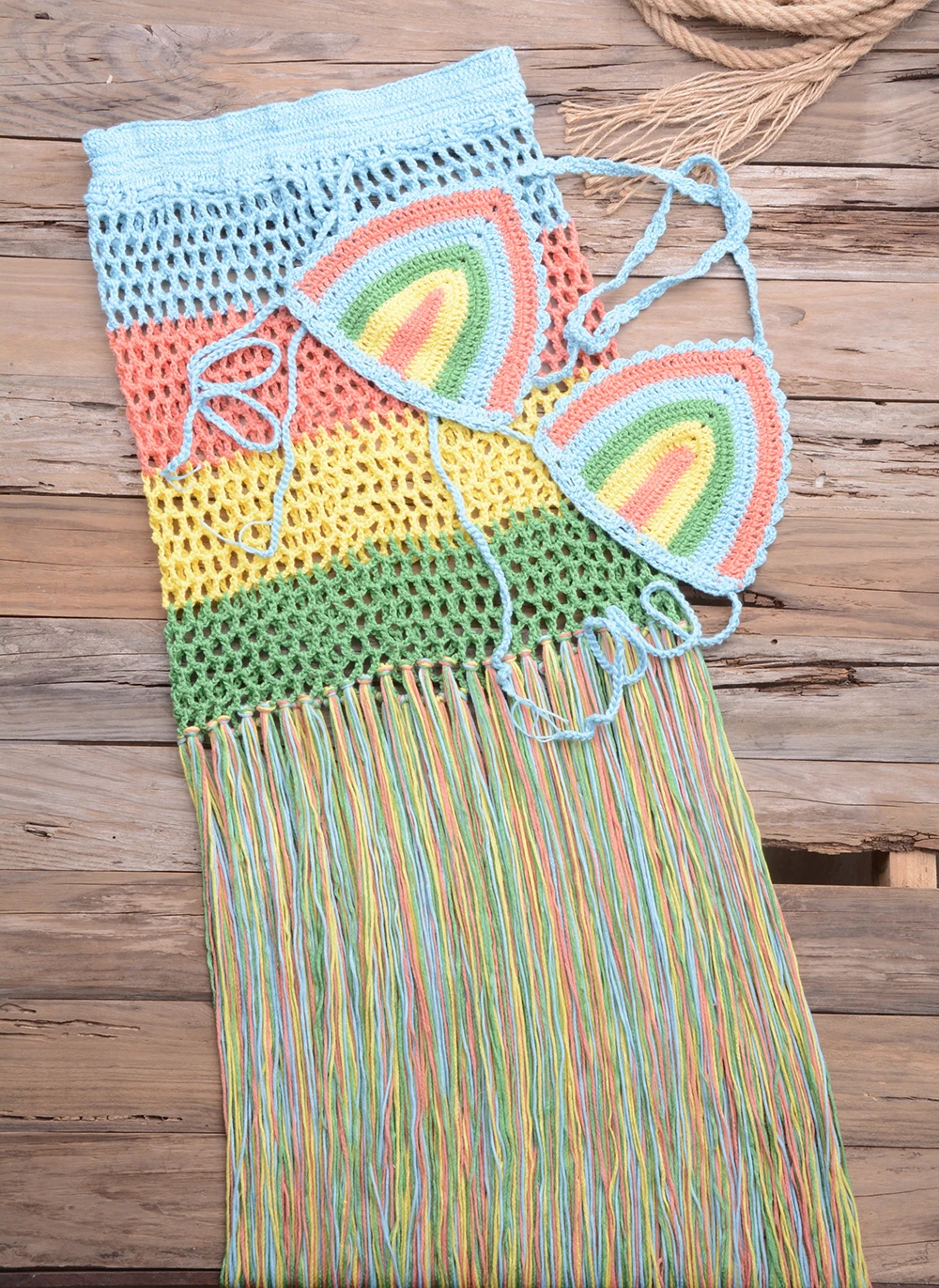 Вязаное крючком пляжное платье сексуальный женский бюстгальтер + длинные юбки с кисточками комплект бикини из 2 предметов купальник накидка