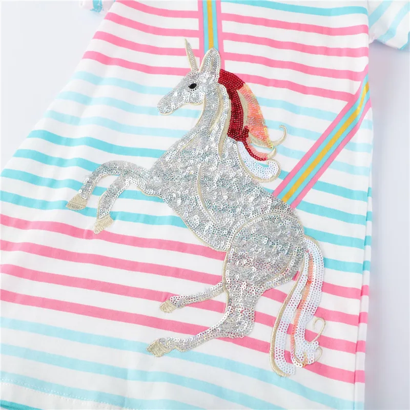 Летние Детские платья для девочек с изображением единорога, бисером, в полоску, туника принцессы, модный дизайн, хлопковые вечерние платья