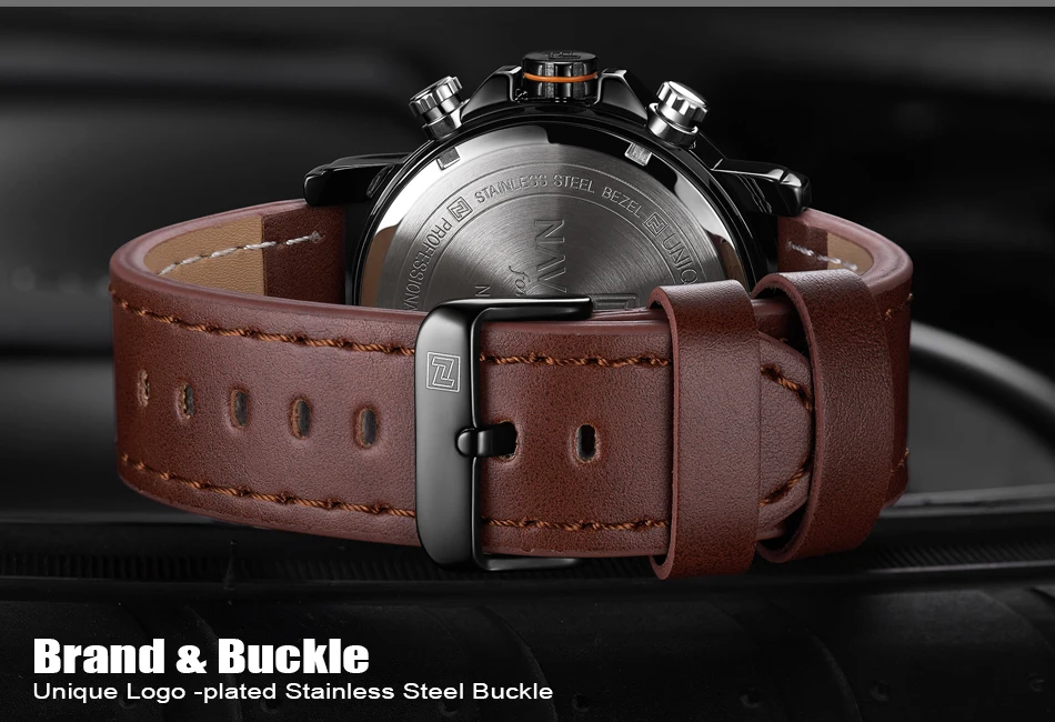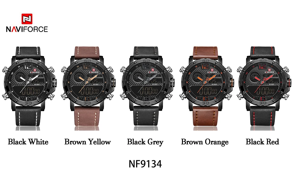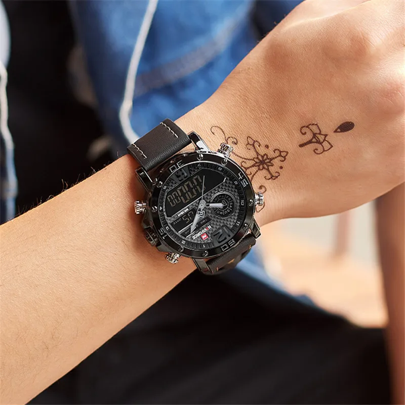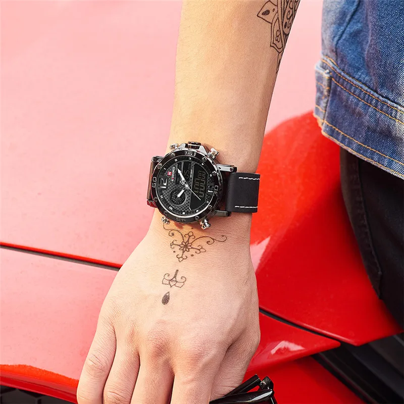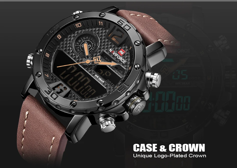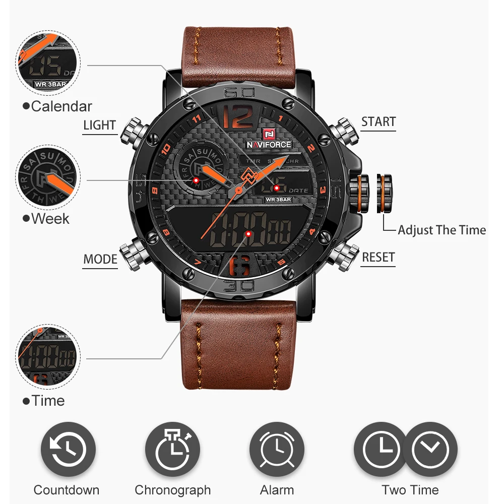 Часы наручные NAVIFORCE Мужские кварцевые светодиодсветодиодный, цифровые спортивные, в стиле милитари, с ремешком из натуральной кожи