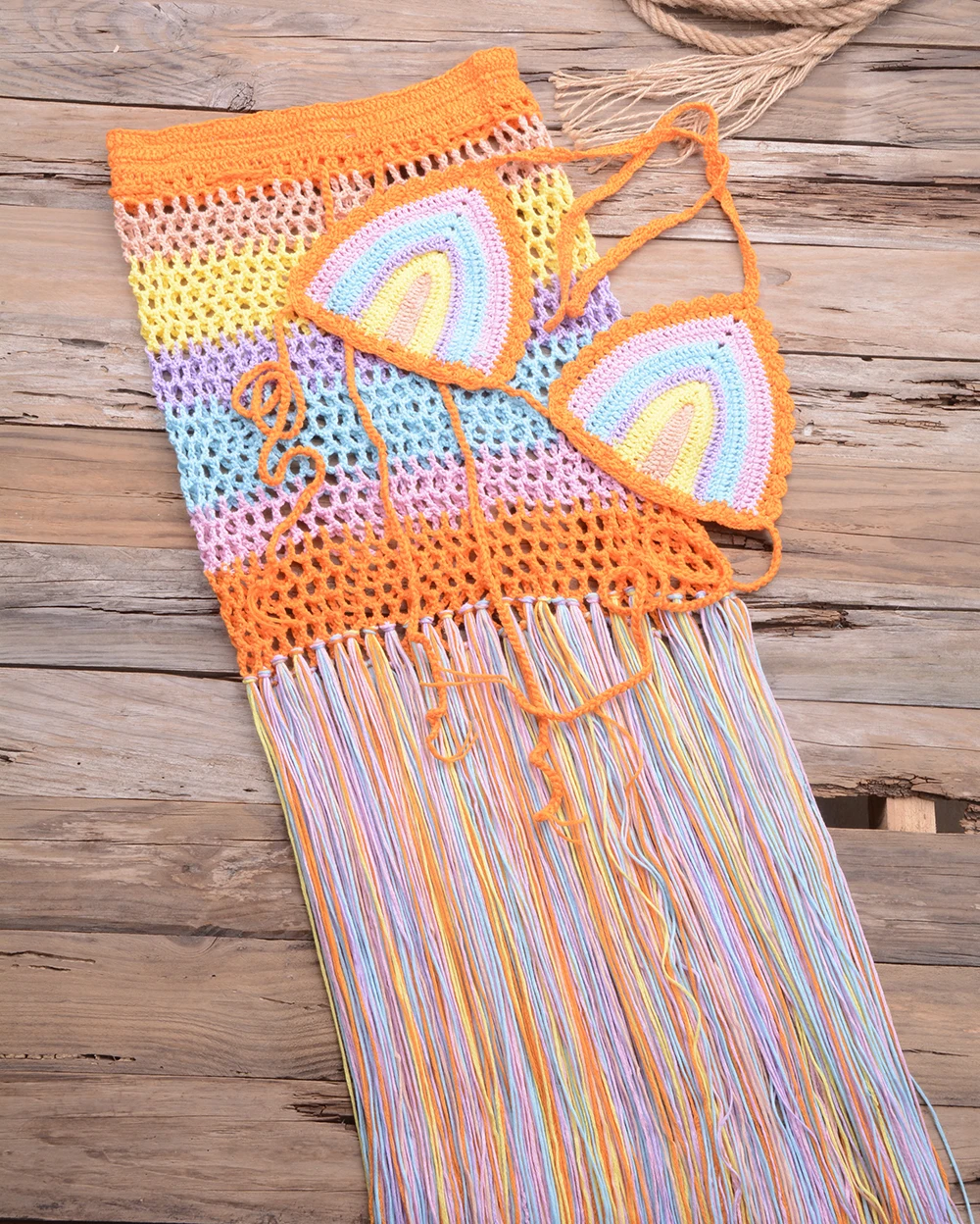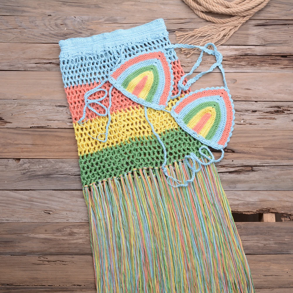 Сексуальная вязаная женская юбка из двух предметов, юбка из искусственной кожи на шнуровке с бахромой, вязаная крючком, Пляжная летняя одежда
