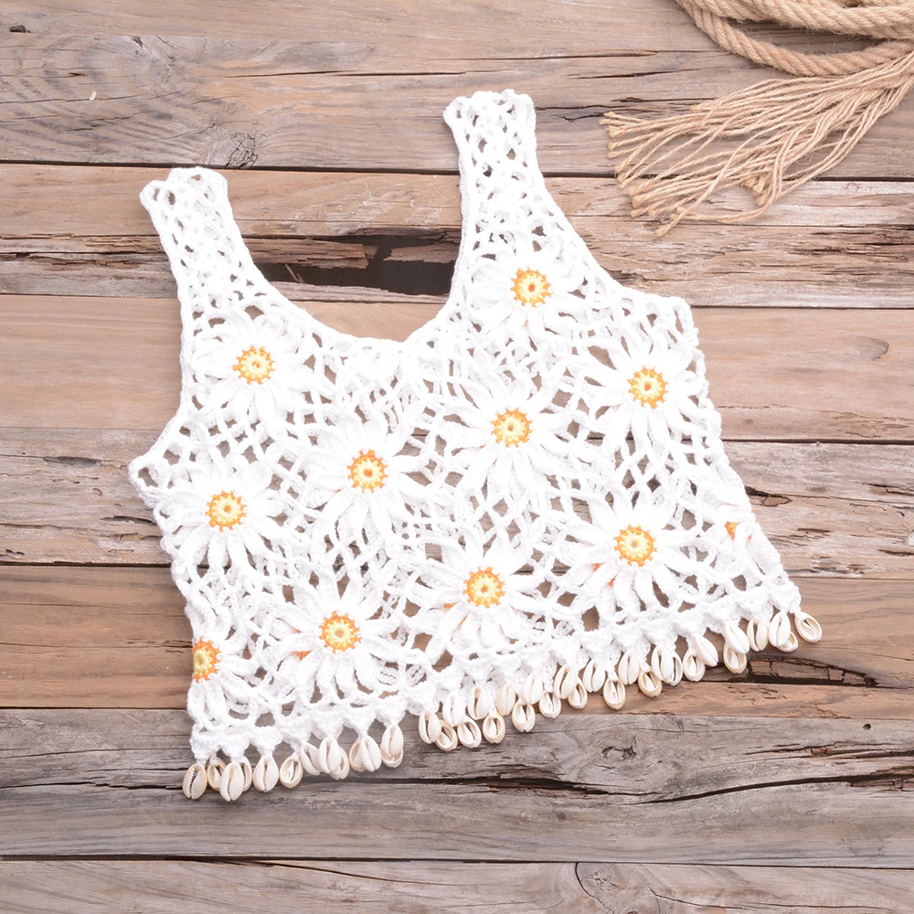 Кроп-топ женский вязаный с вырезами, пикантная майка с бахромой и ракушками, свободная пляжная Повседневная накидка без рукавов, короткая трикотажная рубашка, на лето