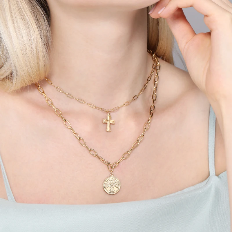 Винтажное многослойное ожерелье, длинное ожерелье с кулоном, женское ожерелье из нержавеющей стали, модное ожерелье с кулоном в виде монеты и Креста, подарок