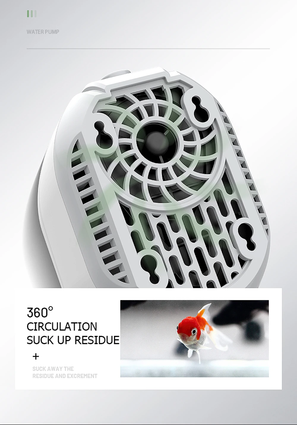 -Дно насоса всасывается в окружающую воду, которая эффективно очищает Кале и примеси рыбы в резервуаре для воды.