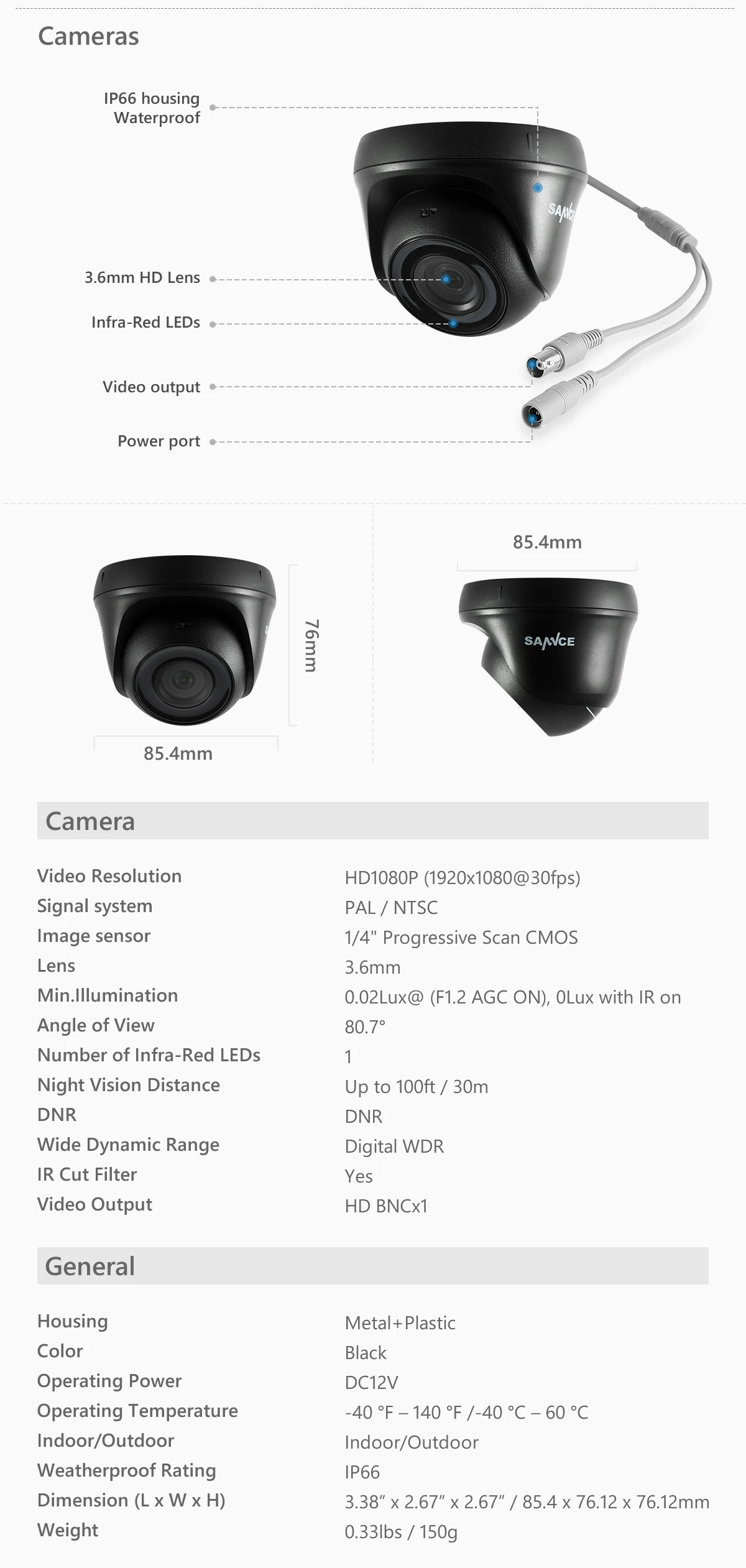 Camera Feature1080P Camera,In/out door;Day&Night;IR Cut