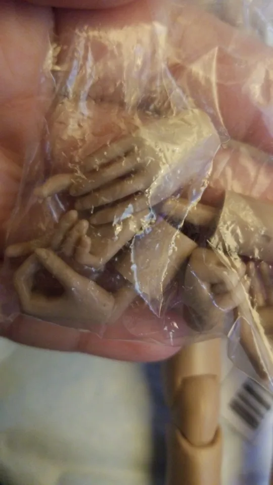 hand are super difficult to insert, i was already on my way to heat it, but i t worked. not that you change it easy. feel too. anchor is not fitting usual heads, it is way too small. the body is silicon, boobs are soft, legs and arms are plastic. feet have articulation too. 4 hand gestures are supplied.