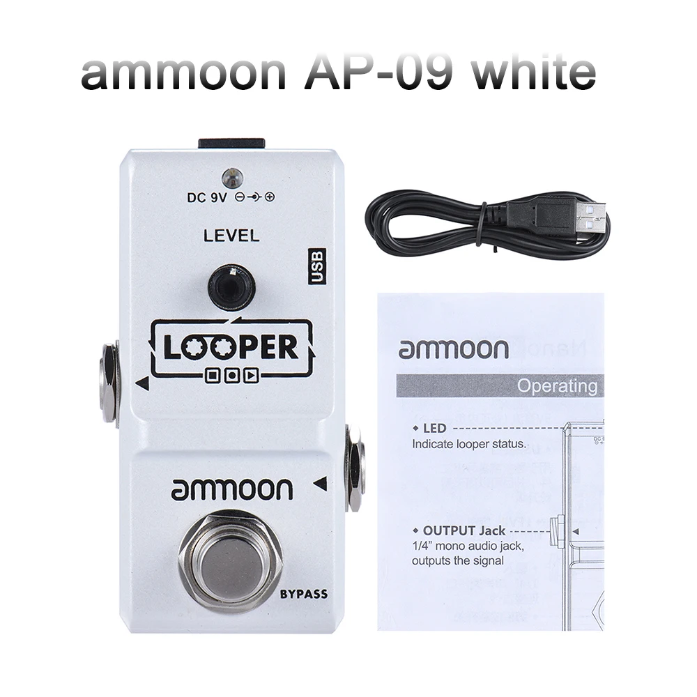 Особенности:Супер Мини размер, изготовлен из алюминиевого сплава, удобный и прочный.С функциями записи (до 10 мин), overdub (неограниченное количество), отмены, повтора и удаления.Простое управление, одна кнопка для достижения практически всех функций.С одной ручкой для регулировки выходной громкости.Светильник для отображения рабочего состояния.Функция True bypass для защиты целостности исходного сигнала.В комплекте идет USB-кабель для загрузки и скачивания аудиофайла с ПК.Характеристики:Бренд: ammoonМодель: AP-09Материал: алюминиевый сплавМаксимальное время записи: 10 минутМаксимальное время передублирования: неограниченноеВход: 1/4 ″ монофонический разъем (сопротивление: 470 ком)Выход: 1/4 ″ монофонический разъем (сопротивление: 100 кОм)Рабочий ток: 94 мАПитание: DC 9V 500mA адаптер (не входит в комплект)Размер товара: 7,5*4*4,5 см/3*1,6 * 1.8inВес изделия: 145 г/5,1 унцииПосылка: 10,5*6,5*5 см/4,1*2,6*2 дюймаВес посылка: 222 г/7,8 унцииПримечание:Адаптер питания в комплект не входит.Только аудиофайл WAV можно загружать в Лупер с компьютера.Вы можете скачать программное обеспечение на http://13723663.s21d-13.faiusrd.com/0/ABUIABBLGAAg_83X0gUo8sSG1Qc?f=loopersoftware1.7.exe&v=1515579131Используйте адаптер питания постоянного тока 9 в 500 мА с положительным полюсом снаружи и отрицательным полюсом внутри. В противном случае изделие может работать неправильно.Комплектация:1 * педаль эффектов для гитары1 * USB-кабель1 * Руководство пользователя (на английском и китайском языках)