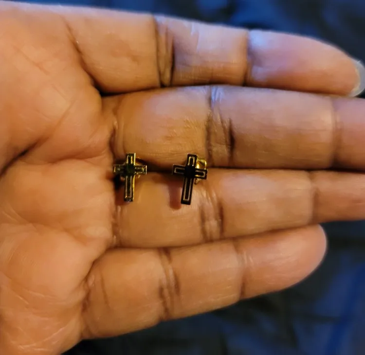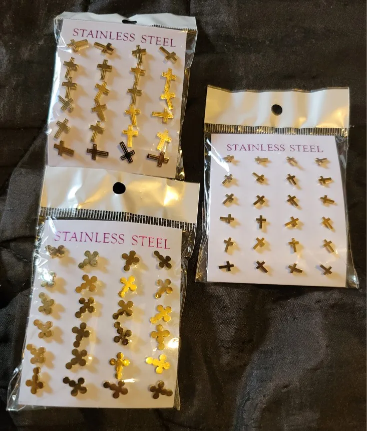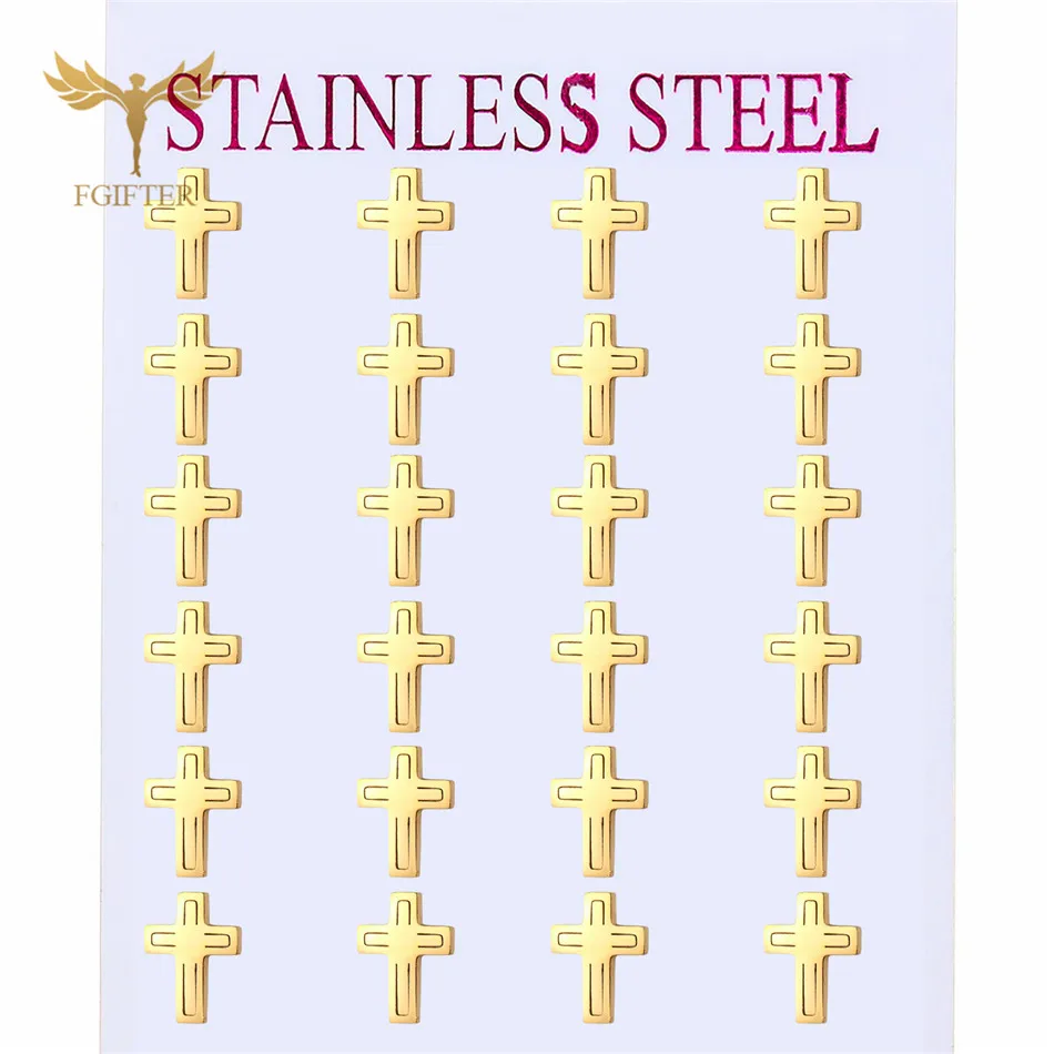Материал: нержавеющая стальВысокое качество на 100% абсолютно новыйЦвет: серьги с золотым крестомПреимущество: не вызывает аллергии, не выцветаетКомплект: 12 пар/лот