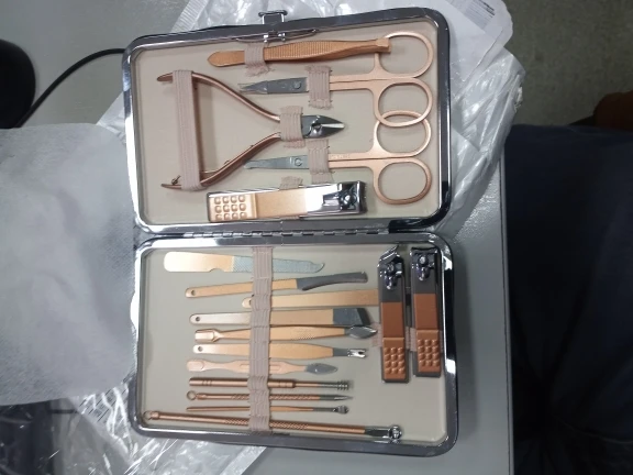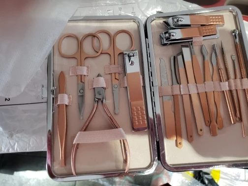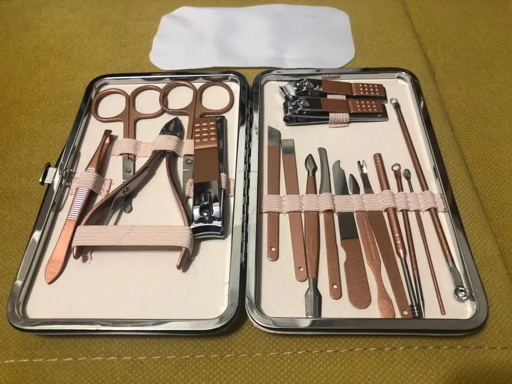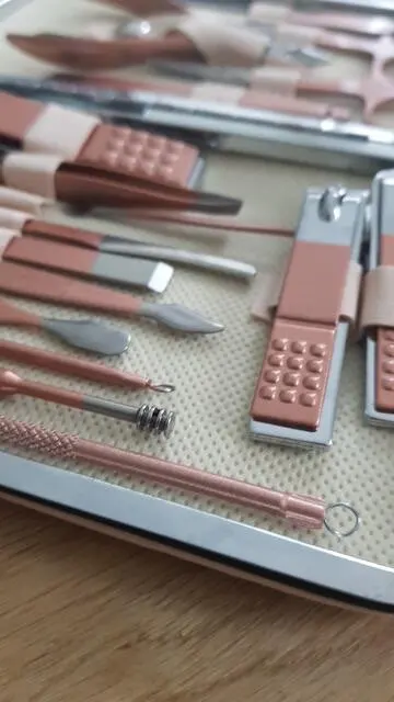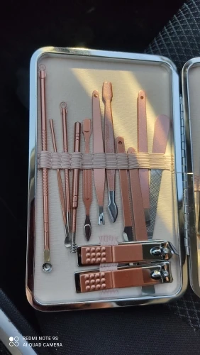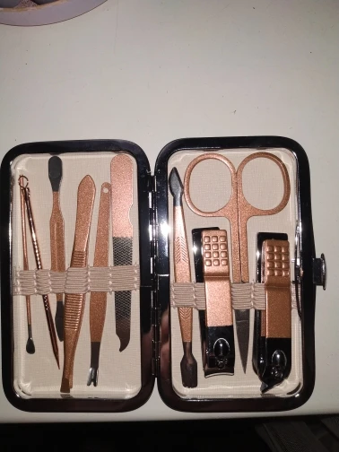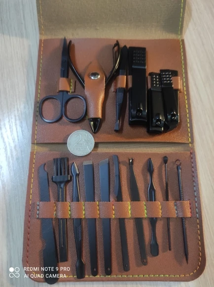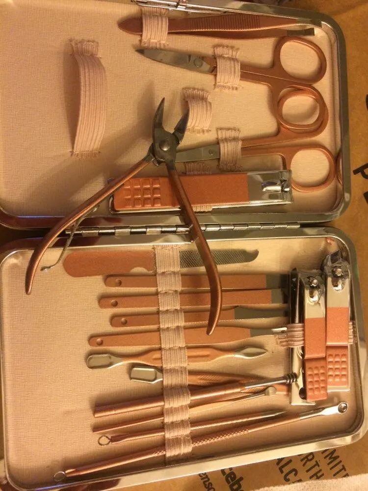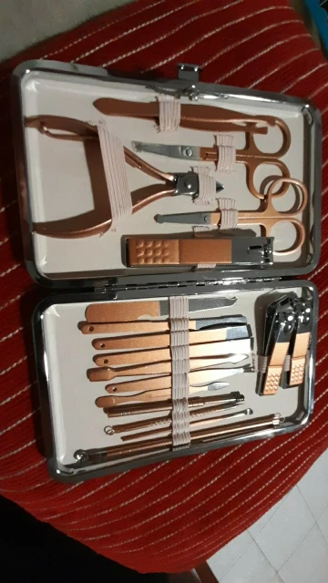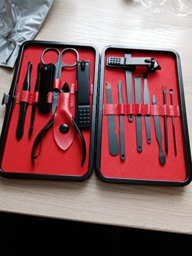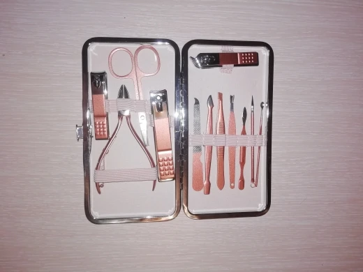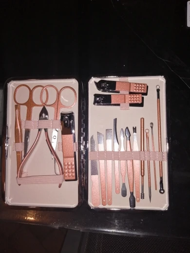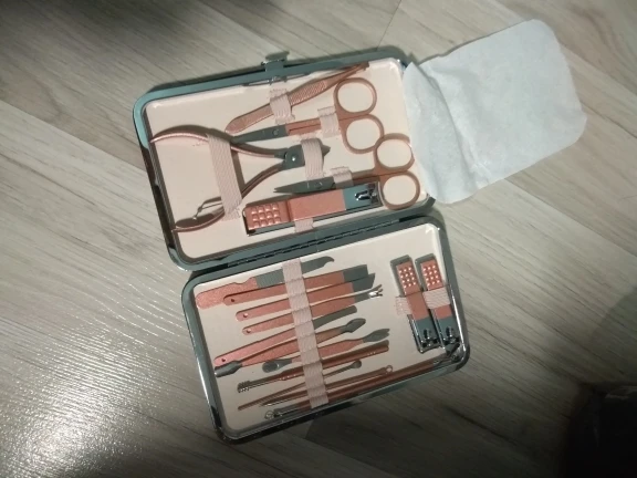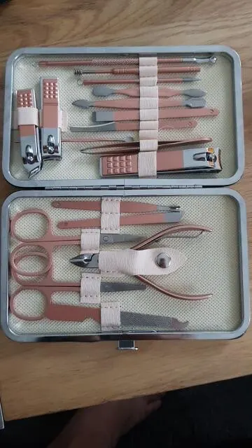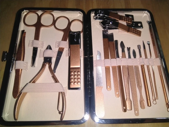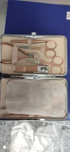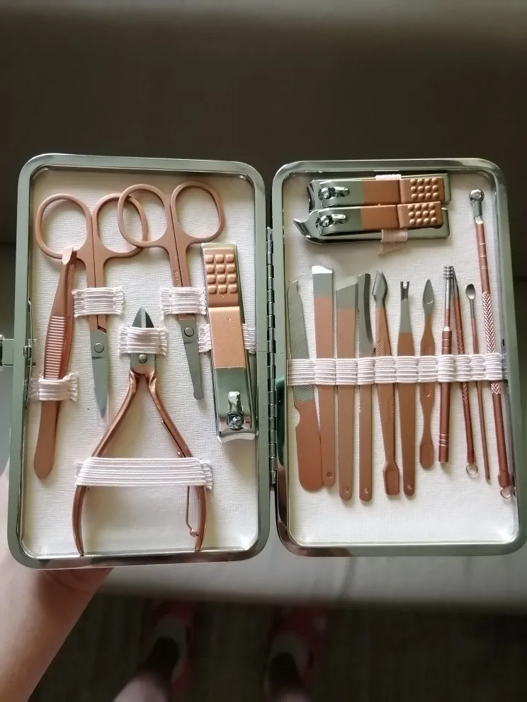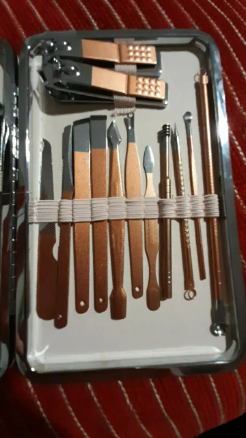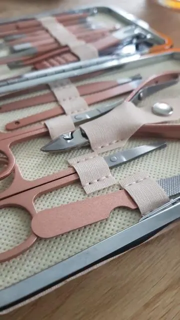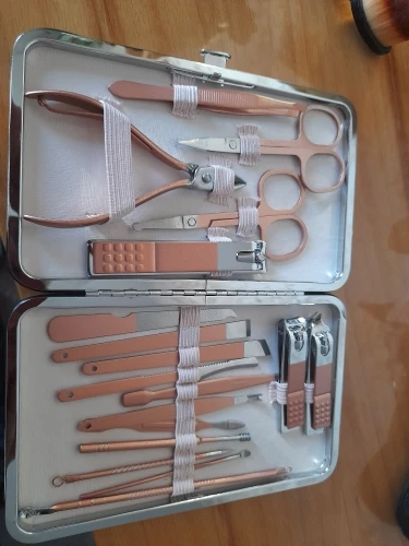 Очень ждала этот набор, слегка разочаровалась (до этого был простой от орифлейма - много лет служил без нареканий). Из плюсов - хорошая коробочка, Кусачки, резаки, всякие штуки для ушей, качество покраски изделий . Из минусов - от пилочки понятно можно было ничего не ждать, пара лопаток совсем игрушечные, не как на фото. Ножницы были как будто с разных собраны - одно лезвие прямое, другое с загибом. И краска местами заходит на рабочую поверхность . Так же не понравилось как пришиты резинки на футляре - думаю быстро распушатся. За нюансы продавец сделал скидку, за что спасибо. Доукомплектовала некоторые предметы своими и в целом довольна.
