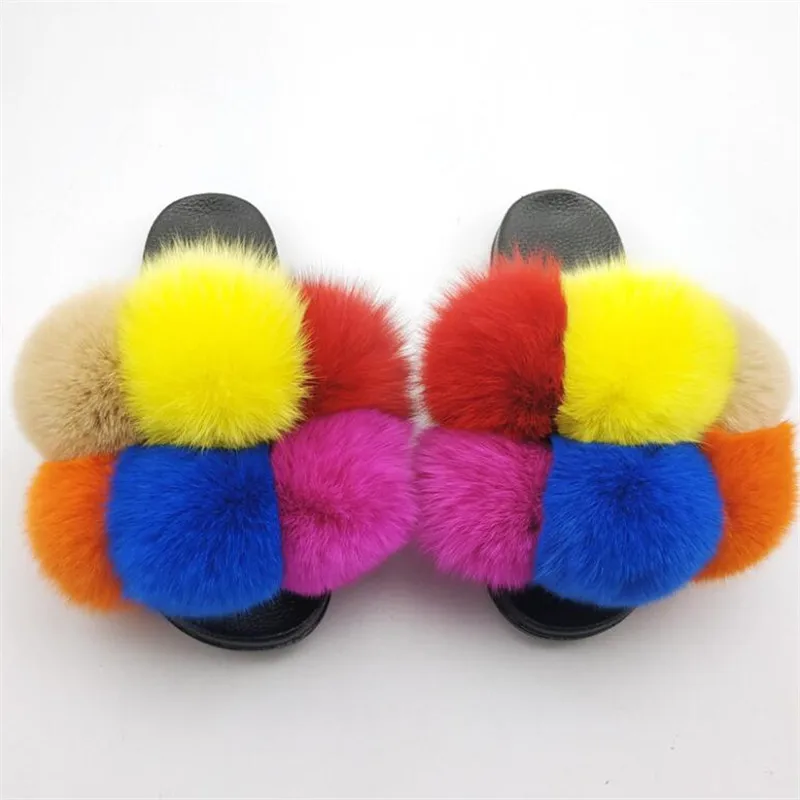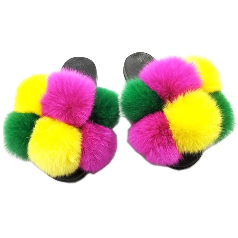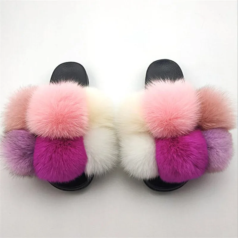 Шлепанцы женские с меховым помпоном, пушистые меховые тапочки, модные сланцы из лисьего меха, плюшевые слайдеры, мяч для волос, сланцы