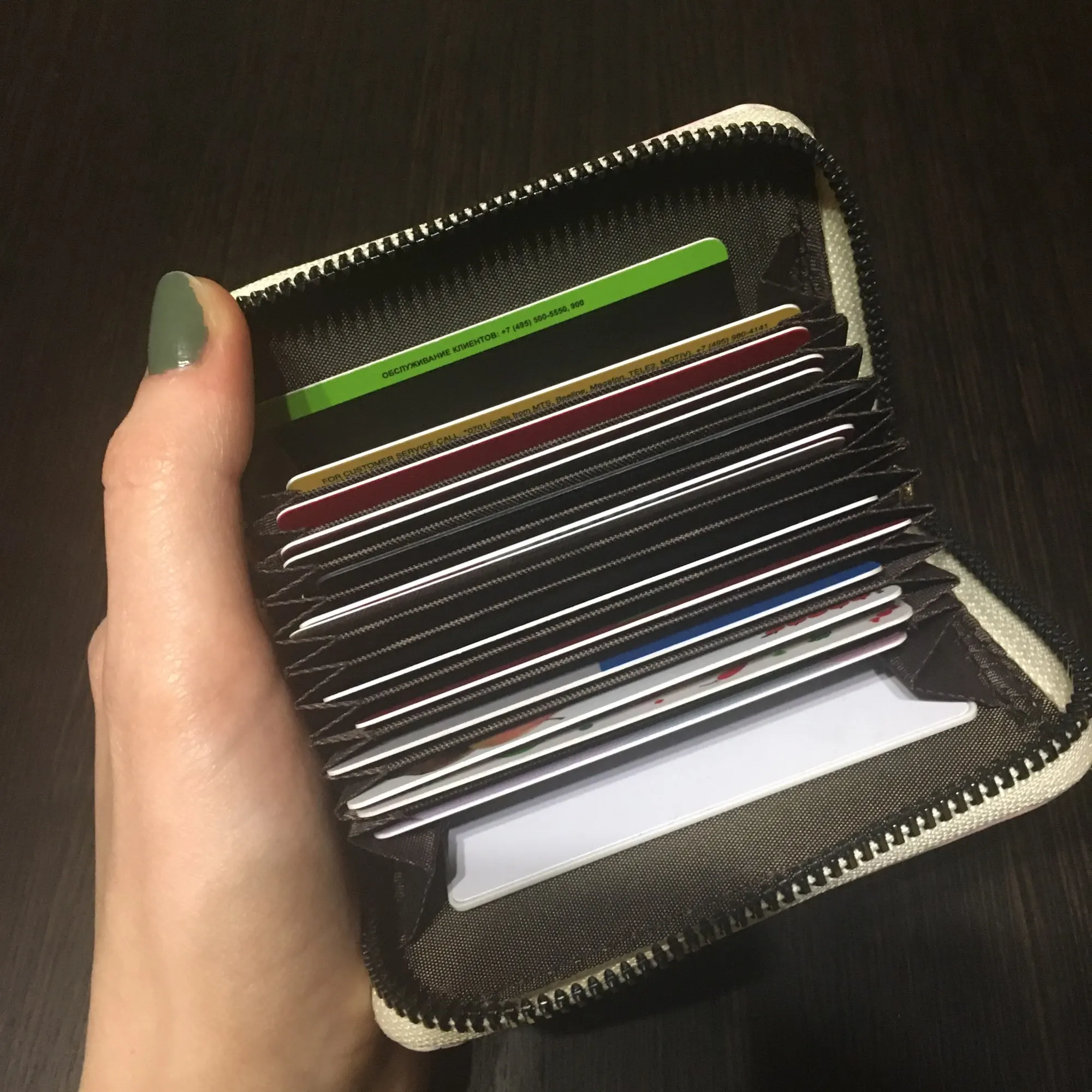 очень хорошая кредитница, выглядит очень качественно. среднее количество мест для карт ~15 шт, но можно класть и по две в одну, главное, чтобы потом замочек не разошёлся. до воронежа шла примерно месяц, может, чуть больше, почему-то тормознули на таможне. в целом советую!