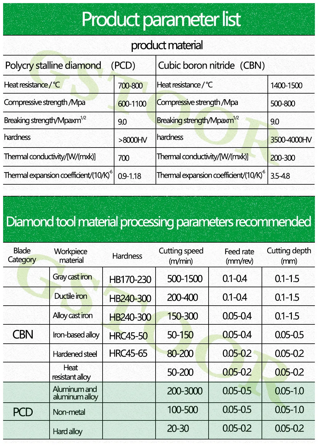 CBN: он обладает чрезвычайно стабильными химическими свойствами для черных металлов и используется для закаленной стали (45-65HRC), подшипниковой стали (60-62HRC), высокоскоростной стали (>62HRC), инструментальная сталь (57-60HRC), и охлажденный чугун, грубый поворот и точный поворот также подходят для высокотемпературных сплавов, материалов термического распыления, Твердые сплавы, содержащие более 10% Co и другие труднодоступные высокоскоростные режущие процессы, которые могут реализовывать токарные вместо шлифовки, что значительно повышает эффективность обработки