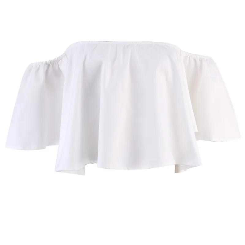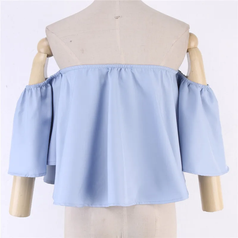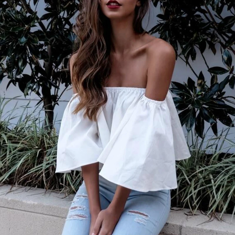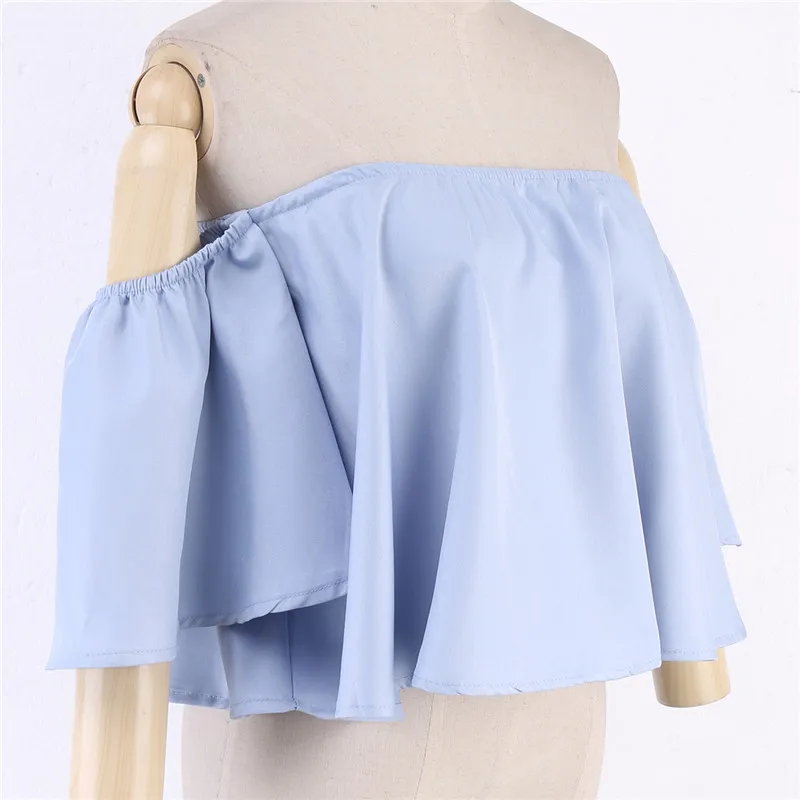 Новинка, Стильный укороченный пуловер для женщин на весну и лето, блузка с расклешенным рукавом и открытыми плечами, однотонная майка, топы, костюм для женщин