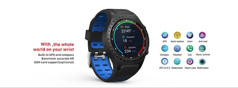 Встроенный GPS/мульти-спортивный режим/Будильник/анти-потеря/Компас/Погода/ответ на вызов/управление музыкой/Bluetooth/шагомер/сердечный ритм