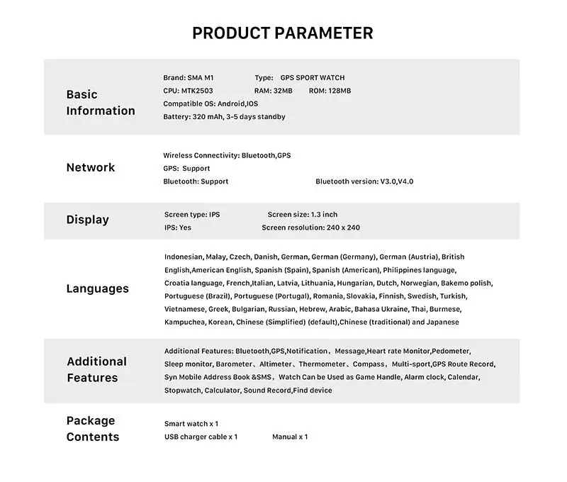 1. Полный круг емкостный сенсорный цветной экран. 2. Встроенный GPS, компас, барометр. 3. Высокоточный пульсометр. Несколько режимов движения. 4. Шагомер, автоматический мониторинг сна. 5. Версия без SIM-карты поддерживает голосовой вызов по Bluetooth. 6. Класс водонепроницаемости IP65, Совместимость с системами IOS и Andriod.