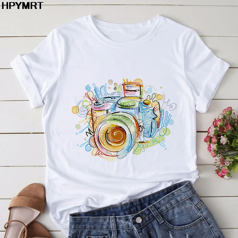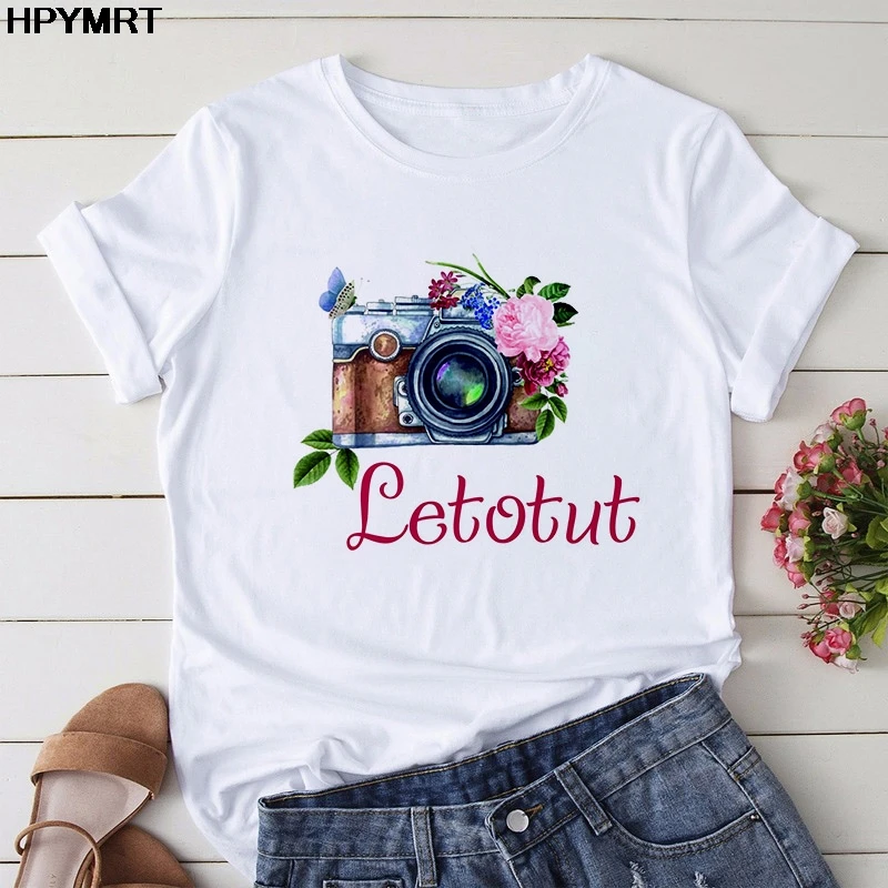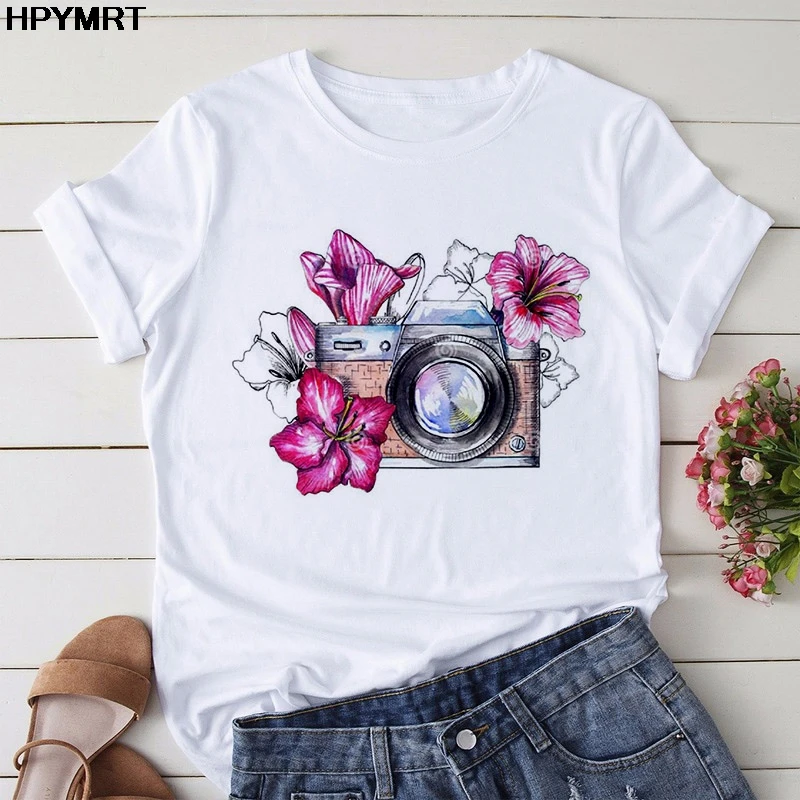 Женская футболка с цветочным принтом Camera, новинка 2020, летняя футболка для влюбленных пар, Повседневная белая футболка Harajuku, женская одежда