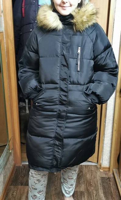 Куртка крутая, ещё и за такую цену. Купила со скидкой почти за 1900. Внутри синтепон дутый. Мех - очень хорошо выглядит и блестит. Расстроилась не много только, что она мне как бэ по размеру и длинна - над коленками, рукава - не очень длинные на мой рост. Хотелось бы чуть по-свободней оверсайз. Нужно было XL заказывать - было бы вообще супер. Что поделать - я высокая! Я ещё на 8м бесяце беременности, правда, и поправилась на 10 кг. Мои параметры сейчас: рост - 180 см, ОГ - 96, ОБ-94. А куртка - красивая. В подарок положили резинку для волос. Спасибо.