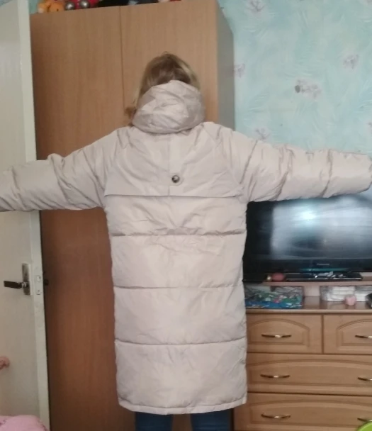 Хороший пуховик, тёплый и длинный, взяла размер xl на последние месяцы беременности, живот помещается