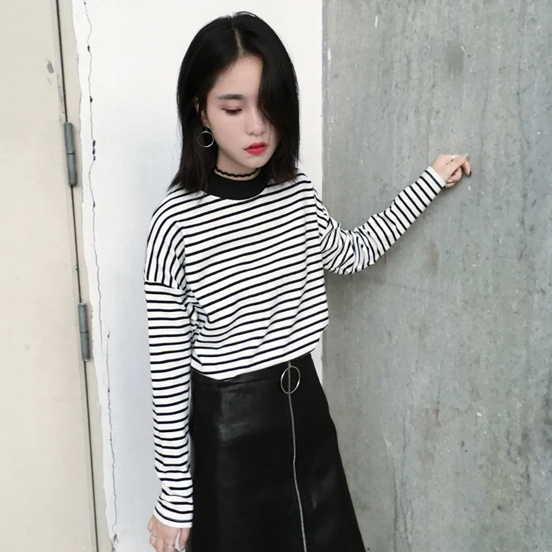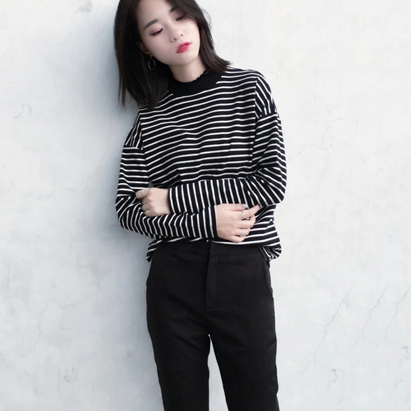 Женская футболка с длинным рукавом, черная или белая Повседневная футболка с круглым вырезом, в полоску, осень 2022