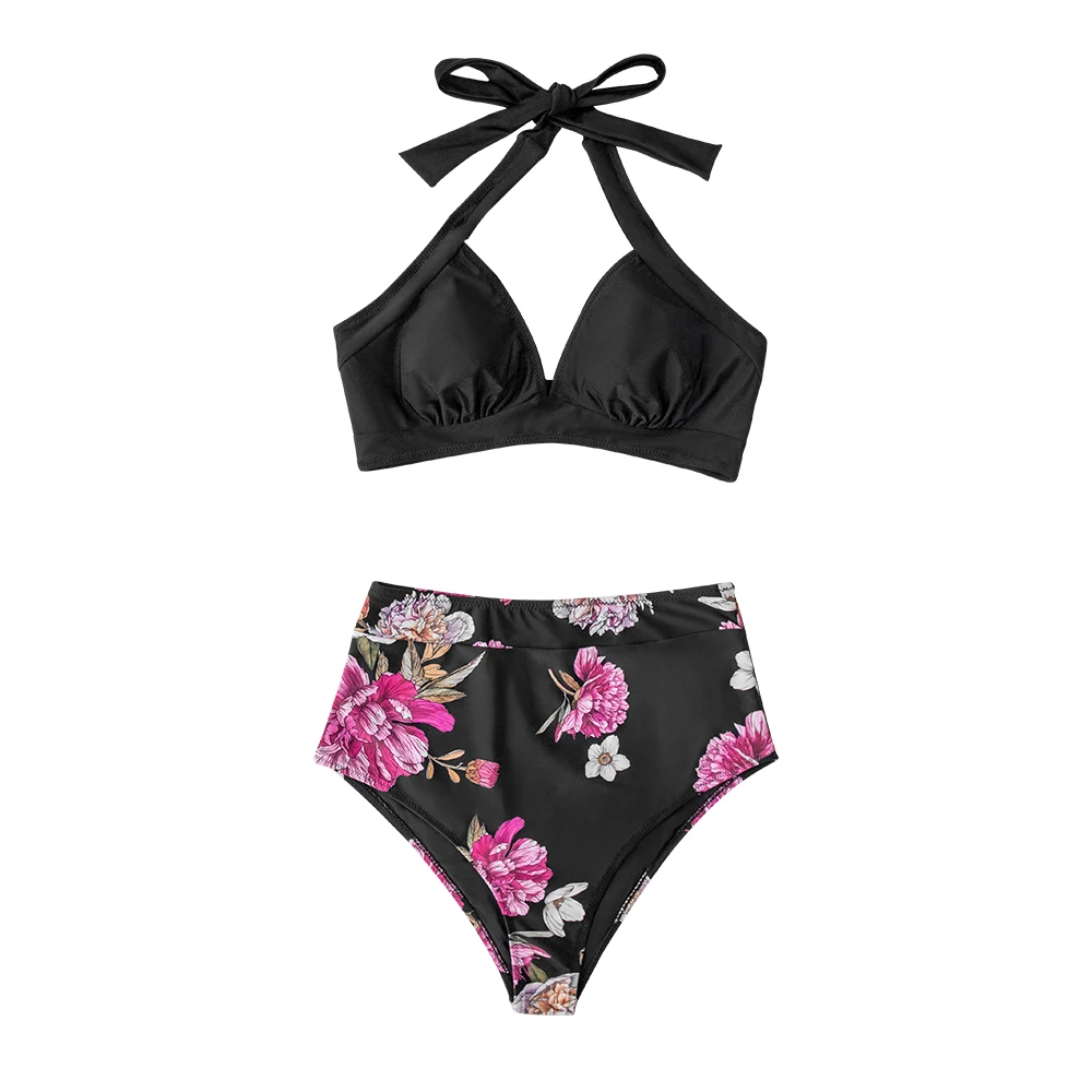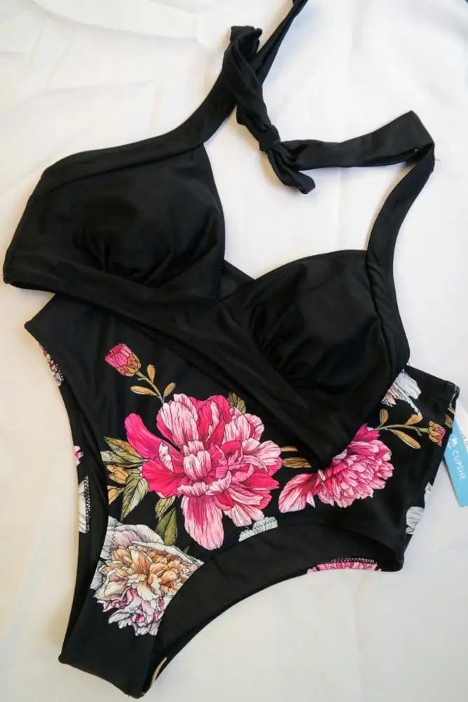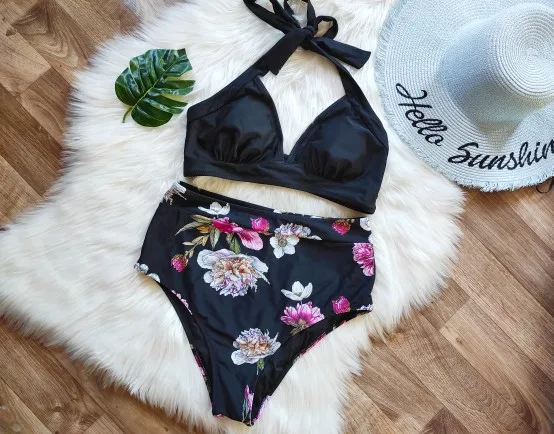 Как вы можете не любить этот черный Цветочный Холтер с высокой талией бикини? Купальник-бикини с бретелькой через шею, однотонным принтом и v-образным вырезом. Брюки с высокой талией и цветочным рисунком обеспечивают лестное покрытие в течение всего дня