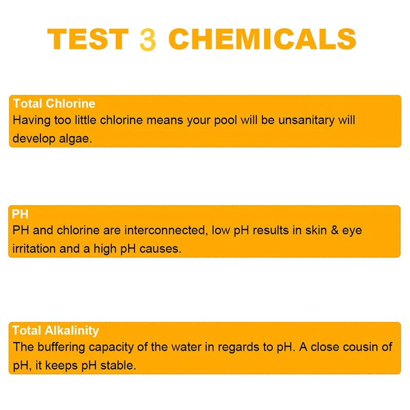 3 в 1 набор тест-полосок? Тест-полоски для химических тестов в бассейне для 3 параметров: общий хлор, pH, общая твердость.