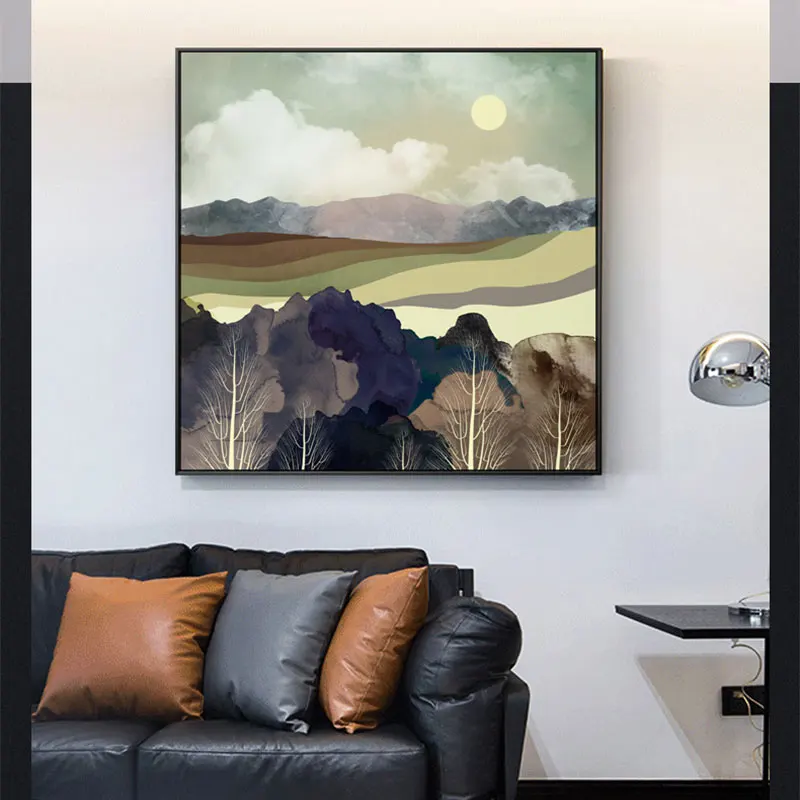 Абстрактный пейзаж на холсте с закатом, настенный постер в китайском стиле, современная живопись, декор для гостиной