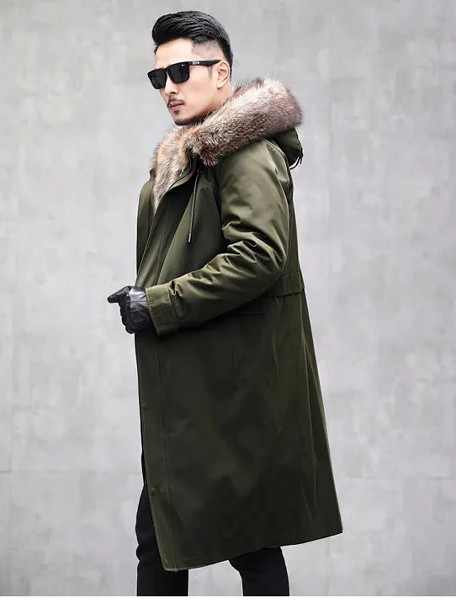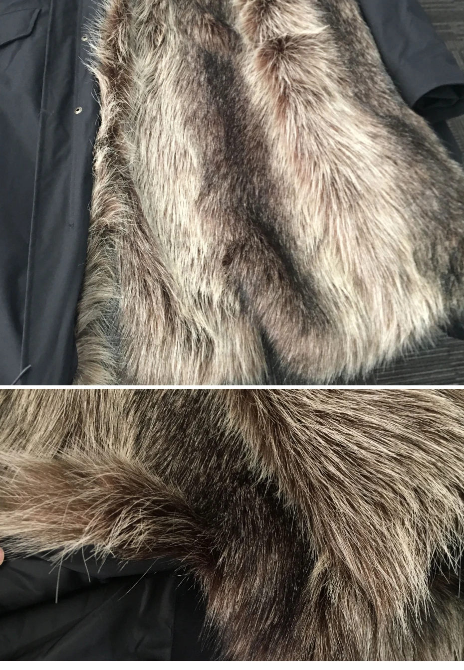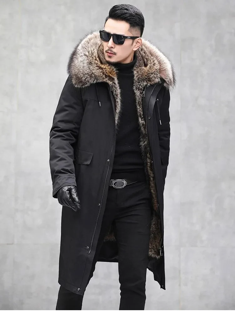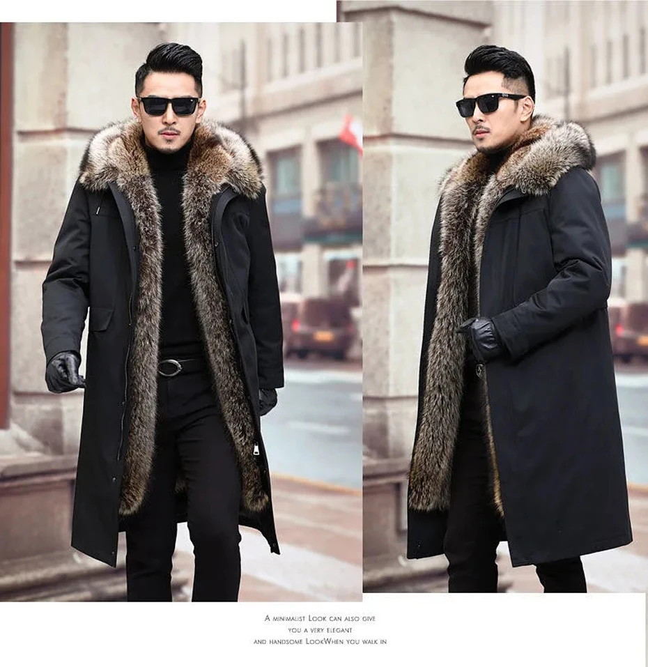 Пальто мужское зимнее длинное с большим меховым воротником, искусственный мех енота