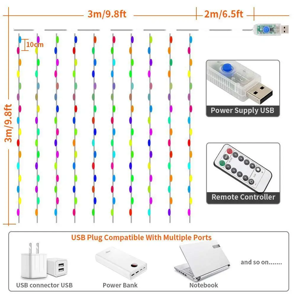СВЕТОДИОДНАЯ Гирлянда-занавеска, USB-гирлянда, 3 м X 3 м, 300 свето...