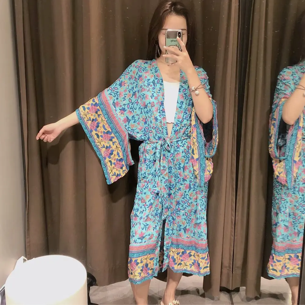 Женское винтажное богемное кимоно с цветочным принтом и рукавами ле...