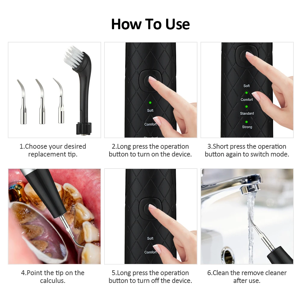 Устройство для удаления зубного камня имеет до 11000 вибраций в минуту и изготовлено из высококачественной нержавеющей стали, которая будет тщательно работать для удаления зубного налета, зубного камня и пищевых отходов на рту.