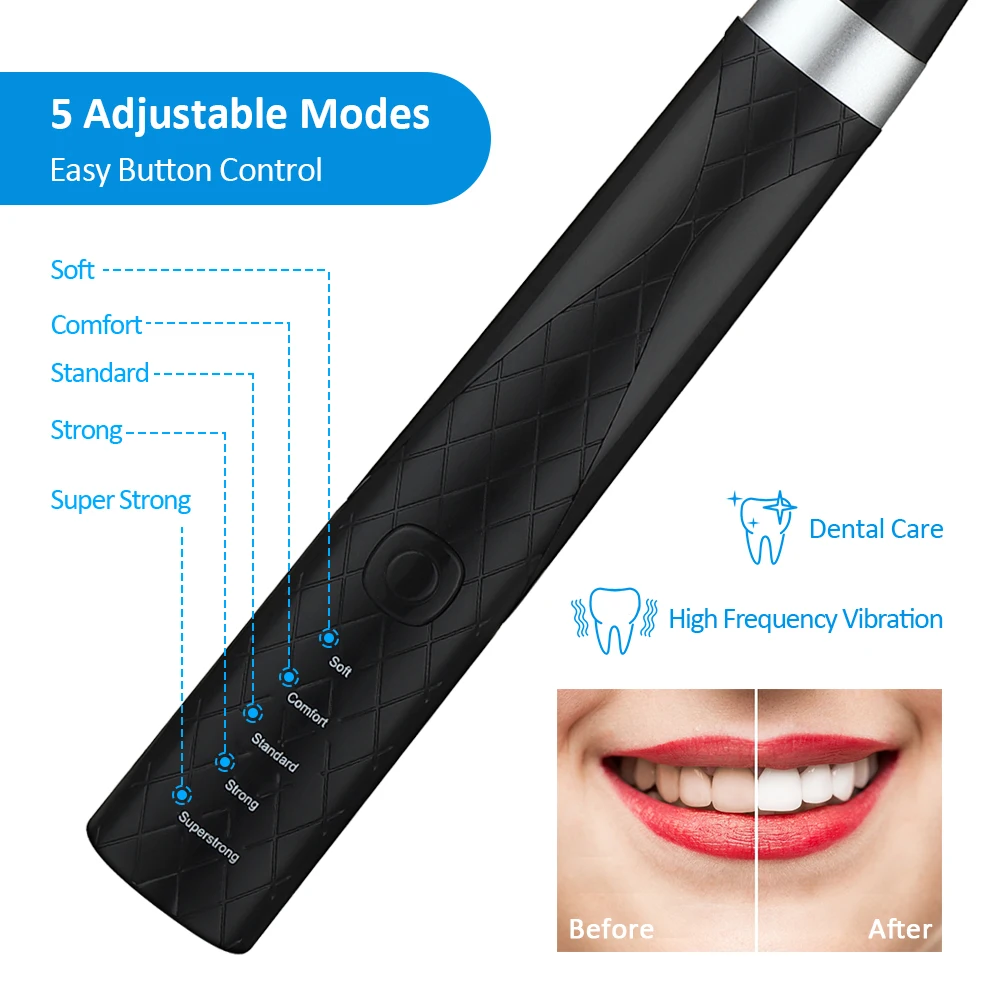 5 регулируемых ModesWith сильный, чистый, белый, полированный, уход за деснами 5 регулируемых режимов прочности подходит для различной чувствительности десен и эффективно удаляет стойкие камни, зубной камень и пятна зубов