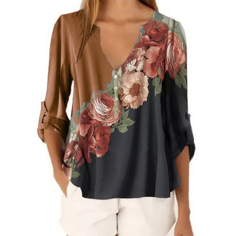 Женская блузка с V-образным вырезом, с цветочным принтом, 2021