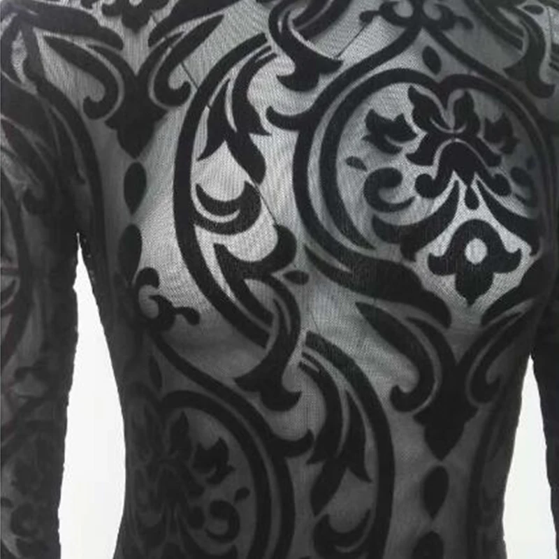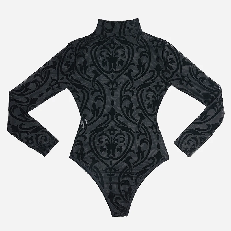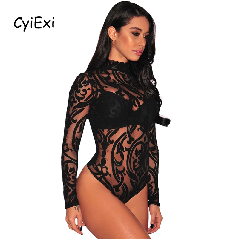 Черное прозрачное Сетчатое сексуальное боди CyiExi, Женское боди с высоким воротником и длинным рукавом, Облегающий комбинезон, женские Клубные топы, одежда для тела