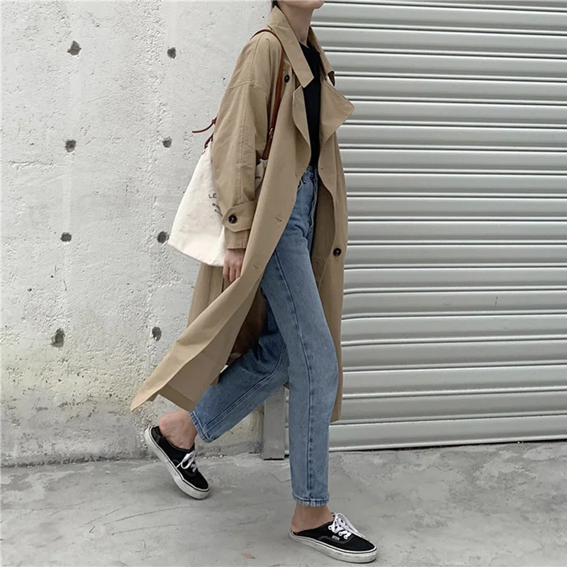 Женский модный мешковатый двубортный Тренч Ulzzang, однотонная прос...