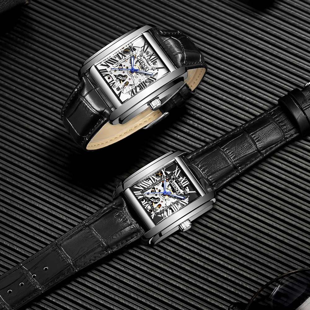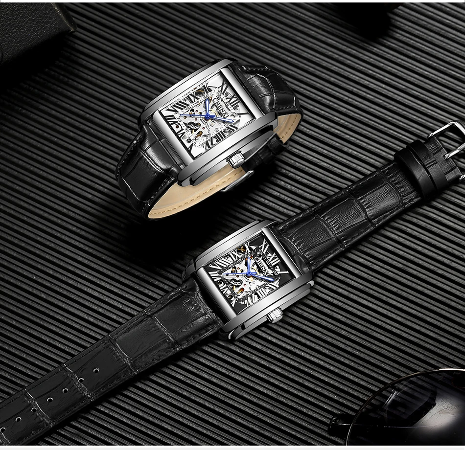 Часы-скелетоны Мужские автоматические, золотистые, прямоугольные, в...