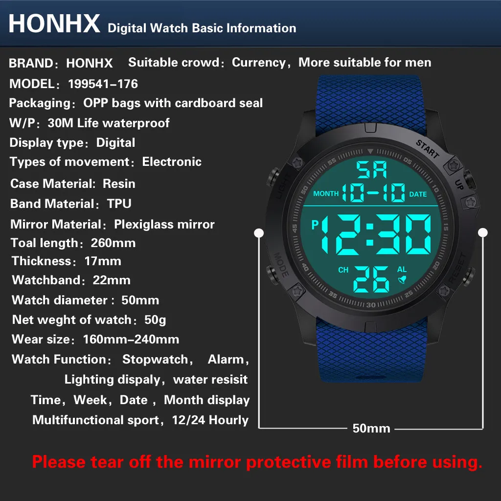 Наружные многофункциональные спортивные часы, мужские классические секундомер, электронный светодиодный наручные часы с подсветкой, 50 м водонепроницаемые цифровые часыВыбор материалов: высококачественный ремешок для часов из искусственной кожи, высококачественный чехол для часов из поликарбоната, прозрачная зеркальная поверхность из смолы, нижняя крышка из нержавеющей стали, Пряжка из нержавеющей сталиГлубина водонепроницаемости 50 м: Не стесняйтесь носить часы, когда вы мочите под дождем, принимайте душ или Мойте руки. Но не нажимайте кнопки под водой. Также избегайте использования при экстремальной горячей или холодной температуреМногофункциональность: отображение времени, секундомер, задний светильник, отображение даты, отображение недели, будильник времени, 12/24 ежечасный, водонепроницаемый, ударопрочный,Модный стиль, многофункциональный дизайн, тонкое мастерство, не пропускать часы, стоит получить его и лучший выбор для подарков