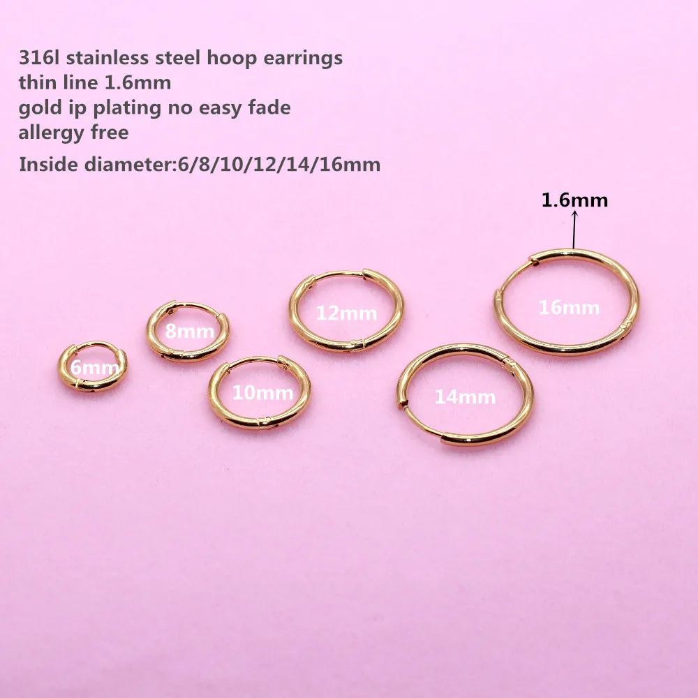 Материал: нержавеющая сталь 316 l, 18-каратное Золотое ip-покрытие, не выцветает 99% человек не вызывают аллергии; Внутренний диаметр: 6/8/10/12/14/16 мм Вы можете выбрать то, что вам нужно. Упаковка: 2 шт. = 1 пара