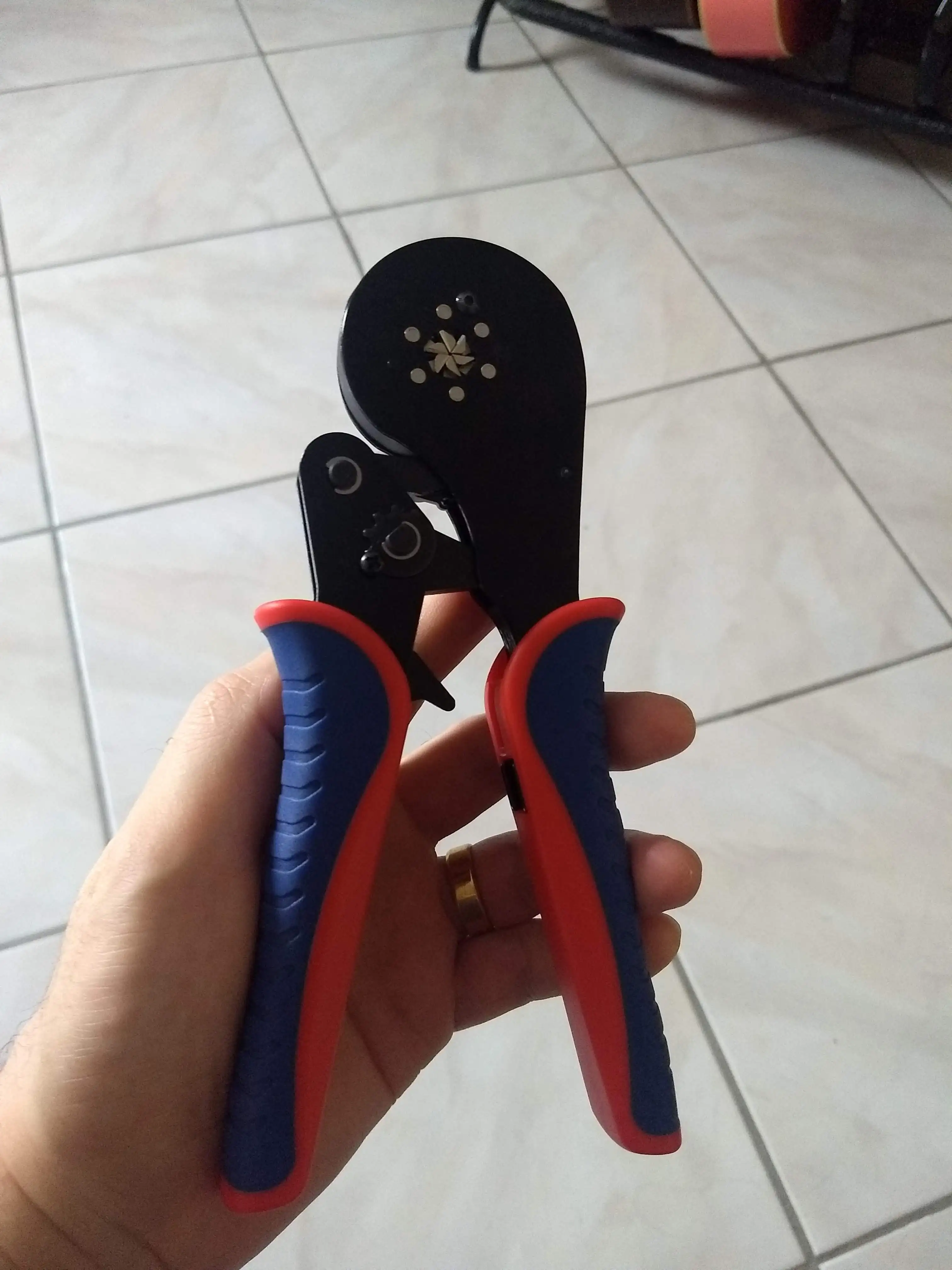 Обжимка пришла очень быстро . кучки приятные на ощупь, красная часть пластик со скруглёнными краями без заусенцев, синяя часть резина. ничего не царапается. Нужно иметь большую кисть руки, потому что при полном раскрытии одной рукой дотянуться тяжеловато. но у меня рука средних размеров. Качеством доволен .