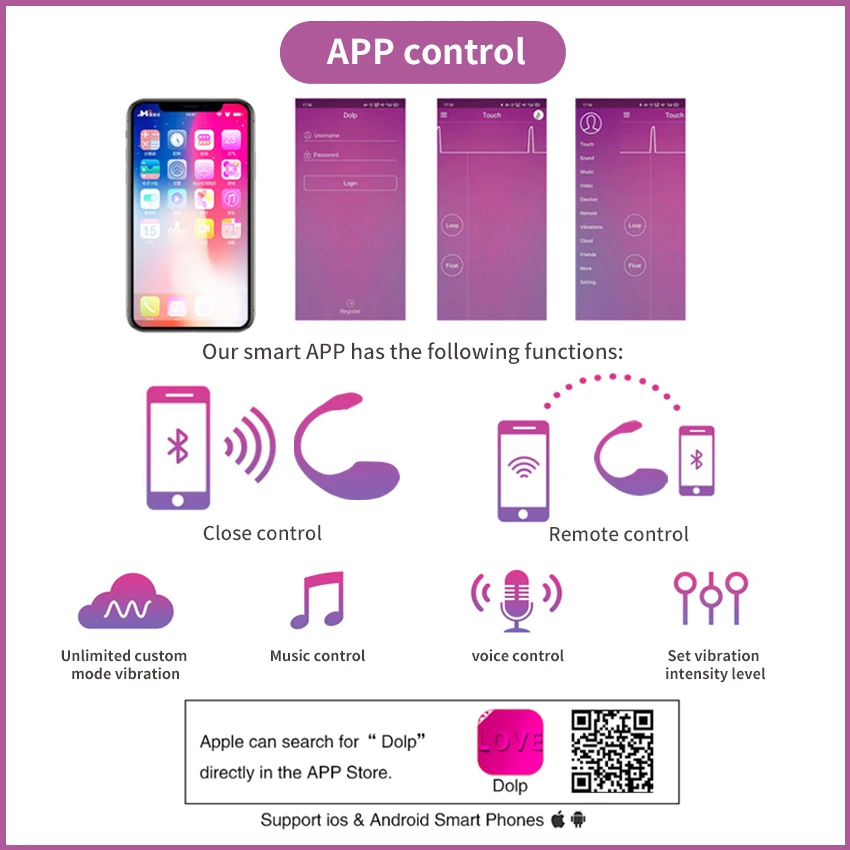 ОсобенностиМногократные варианты использования, домашние или общественные (мощные и бесшумные).Супер-мягкий силиконовый корпус, безопасный для всех типов кожи и 100% водонепроницаемый.Музыка, прикосновение, голос, видео и дистанционное управление-бесконечное Сочетание удовольствия и удовольствия!Дистанционное управление и сильная вибрация по технологии Bluetooth антенны.Глобальная платформа обмена-приложение позволяет создавать, загружать и делиться вибрационными узорами!Dolp вибратор-это революционный продукт с приложениями (бесплатно для Android и iOS), разработанный специально для женщин, а не только для вибрации.Получайте больше удовольствия от приложения: Подключайтесь к приложению через Bluetooth, общайтесь с другими покупателями в App community. Это позволяет испытать записанные вибрационные узоры других людей и даже ожидать «романтической встречи», позвольте ему или ей управлять вашим вибратором!Технические характеристикиМатериал: безопасный силикон.Водонепроницаемость: Да (использование и очистка).Рабочий голос: менее 45 дБ.Зарядка: Зарядка от USB.Время зарядки: 1-2 часа.Время использования: более 2 часов.Режим управления: мобильное приложение или ручное управление.Глобальная платформа обмена: приложение позволяет создавать, загружать и делиться вибрационными узорами.Вы можете скачать приложения, выполнив поиск «Dolp» в Google Play или App StoreЧто входит в комплект:1 x вибратор1 Руководство пользователя1 х пылезащитный мешок1 x зарядный кабель