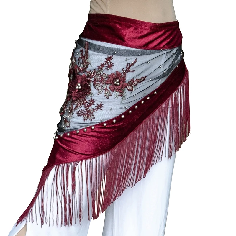 Одежда для танца живота с вышивкой, бархатная ткань, бахрома, треугольный пояс, племенные цветы, набедренный шарф, прозрачная сетка