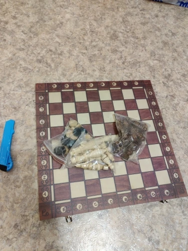шахматы пришли с сильной задержкой. обещали 10 дней доставки, должны были прийти 29 апреля, я покупала как подарок. в итоге пришли 5 мая, на следующий день после дня рождения... очень обидно . по качеству все хорошо, только по нардам непонятно. Всё фишечки не помещаются в ряд, и только 12 штук. а я посмотрела в интернете должно помещаться 15. и чёрных на 1 фишечку больше, чем белых. и они все разного размера по толщине, одна фишечка не совсем круглая. сами шахматы нормальные, фигура коня, как и у других продавцов, страшная. но за такие деньги лучше не нашла фигурок. Магниты хорошие, все держат.